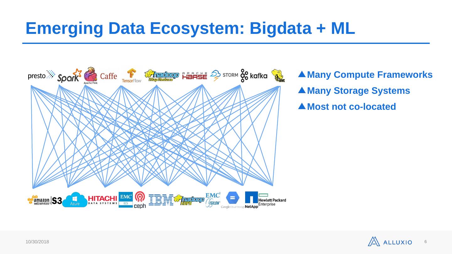 6 .Emerging Data Ecosystem: Bigdata + ML Many Compute Frameworks Many Storage Systems Most not co-located 10/27/18 6
