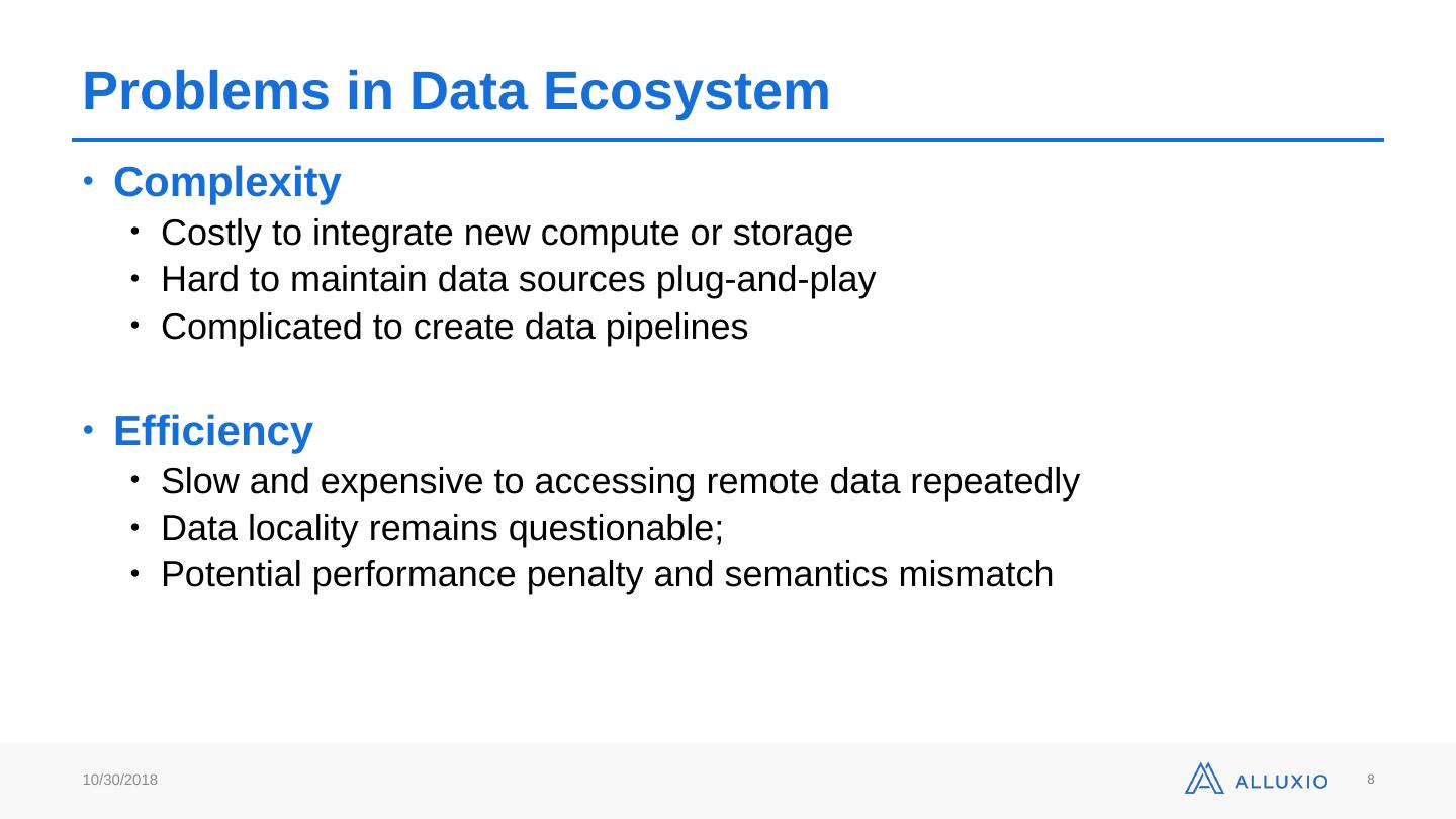 8 .Problems in Data Ecosystem Complexity Costly to integrat e new compute or storage Hard to maintain data sources plug-and- play Complicated to create data pipelines Efficiency Slow and expensive to accessing remote data repeatedly Data locality remains questionable; Potential performance penalty and semantics mismatch 10/27/18 8