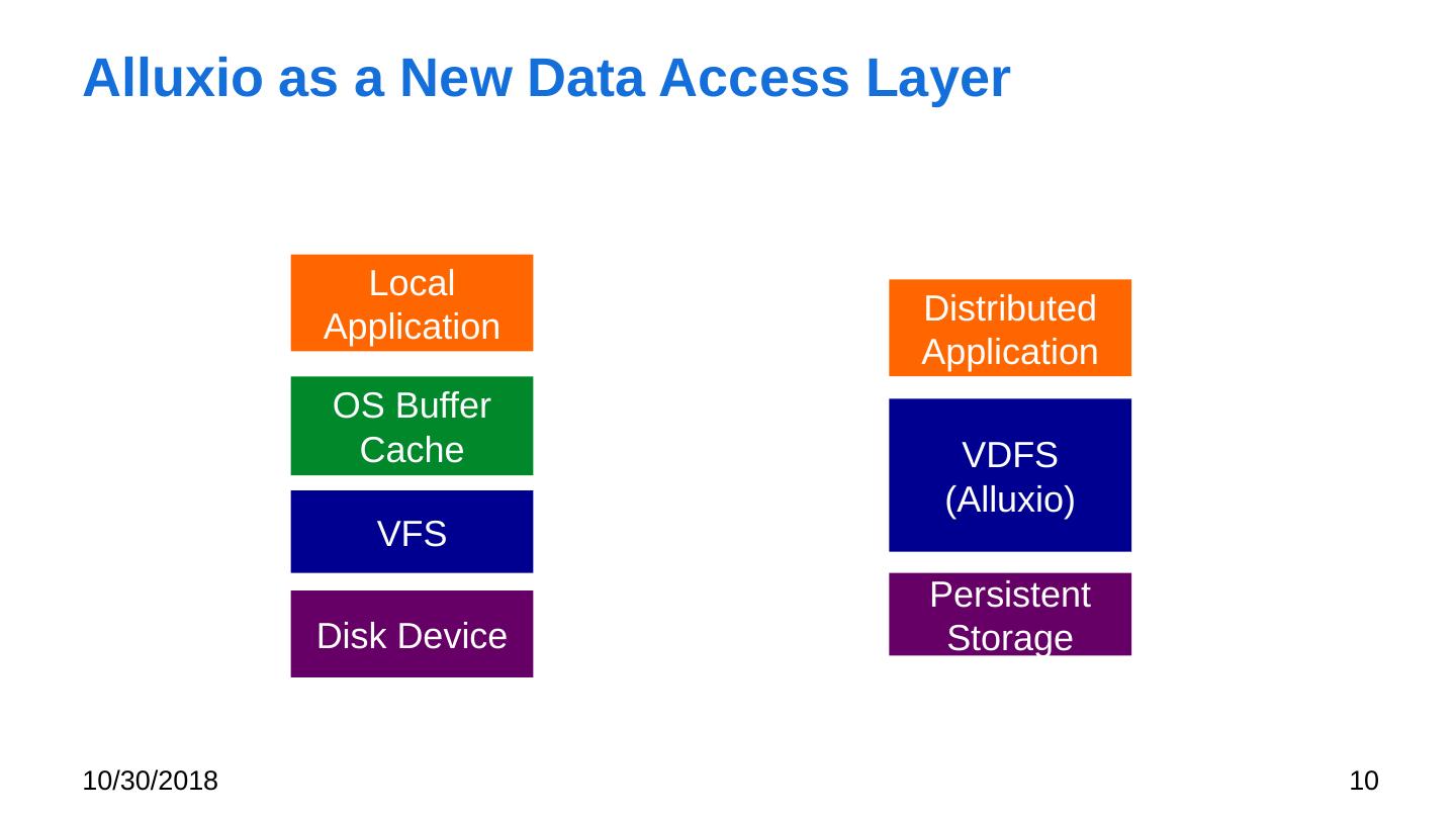 10 .VFS OS Buffer Cache Disk Device Local Application VDFS (Alluxio) Persistent Storage Distributed Application Alluxio as a New Data Access Layer 10/27/18 10