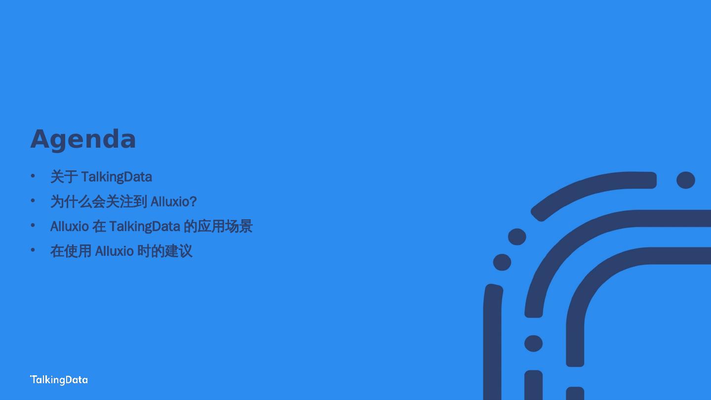 2 .Agenda 关于 TalkingData 为什么会关注到 Alluxio ? Alluxio 在 TalkingData 的应用场景 在使用 Alluxio 时的建议