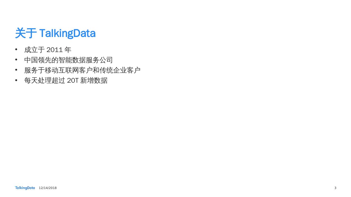 3 .成立于 2011 年 中国领先的智能数据服务公司 服务于移动互联网客户和传统企业客户 每天处理超过 20T 新增数据 关于 TalkingData