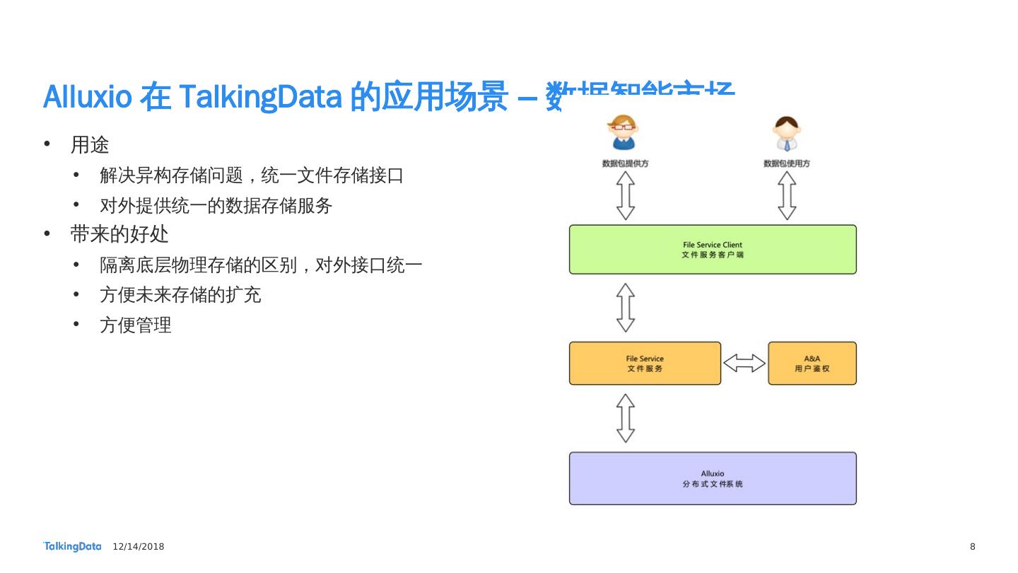 7 .用途 用作分布式缓存,存放热数据,解决数据处理性能问题 采用内存 +SSD 的分层存储 带来的好处 大大提高了数据处理的性能 开发简单 易于管理和维护 Alluxio 在 TalkingData 的应用场景 - 数据中心