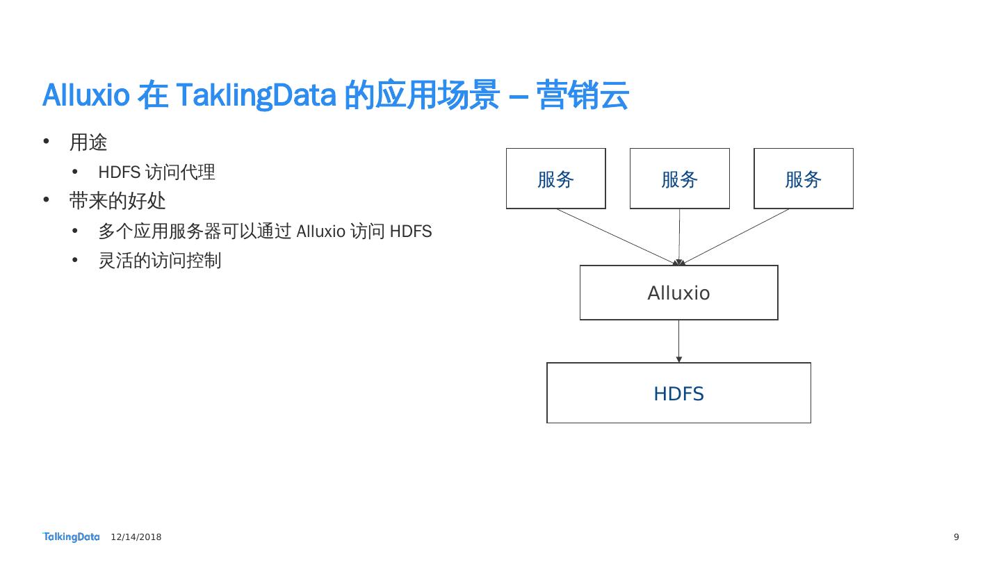 8 .用途 解决异构存储问题,统一文件存储接口 对外提供统一的数据存储服务 带来的好处 隔离底层物理存储的区别,对外接口统一 方便未来存储的扩充 方便管理 Alluxio 在 TalkingData 的应用场景 – 数据智能市场