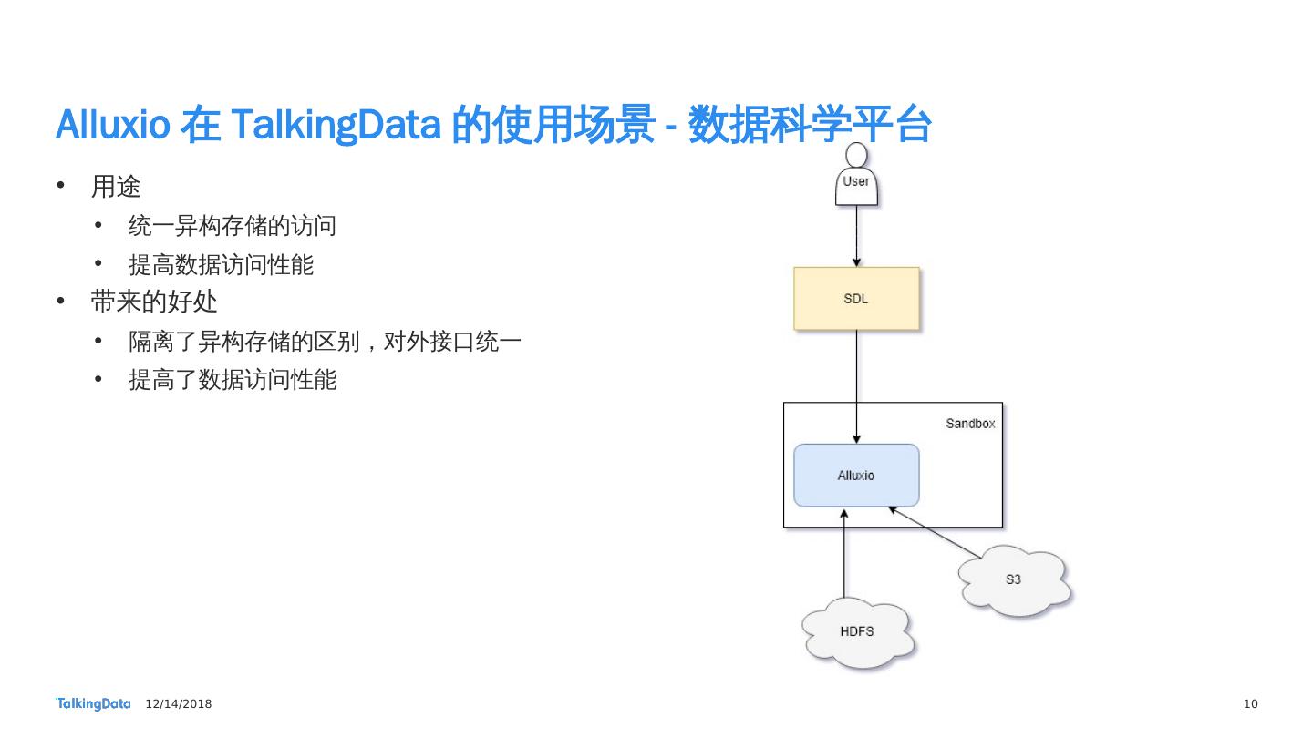 10 .用途 统一异构存储的访问 提高数据访问性能 带来的好处 隔离了异构存储的区别,对外接口统一 提高了数据访问性能 Alluxio 在 TalkingData 的使用场景 - 数据科学平台