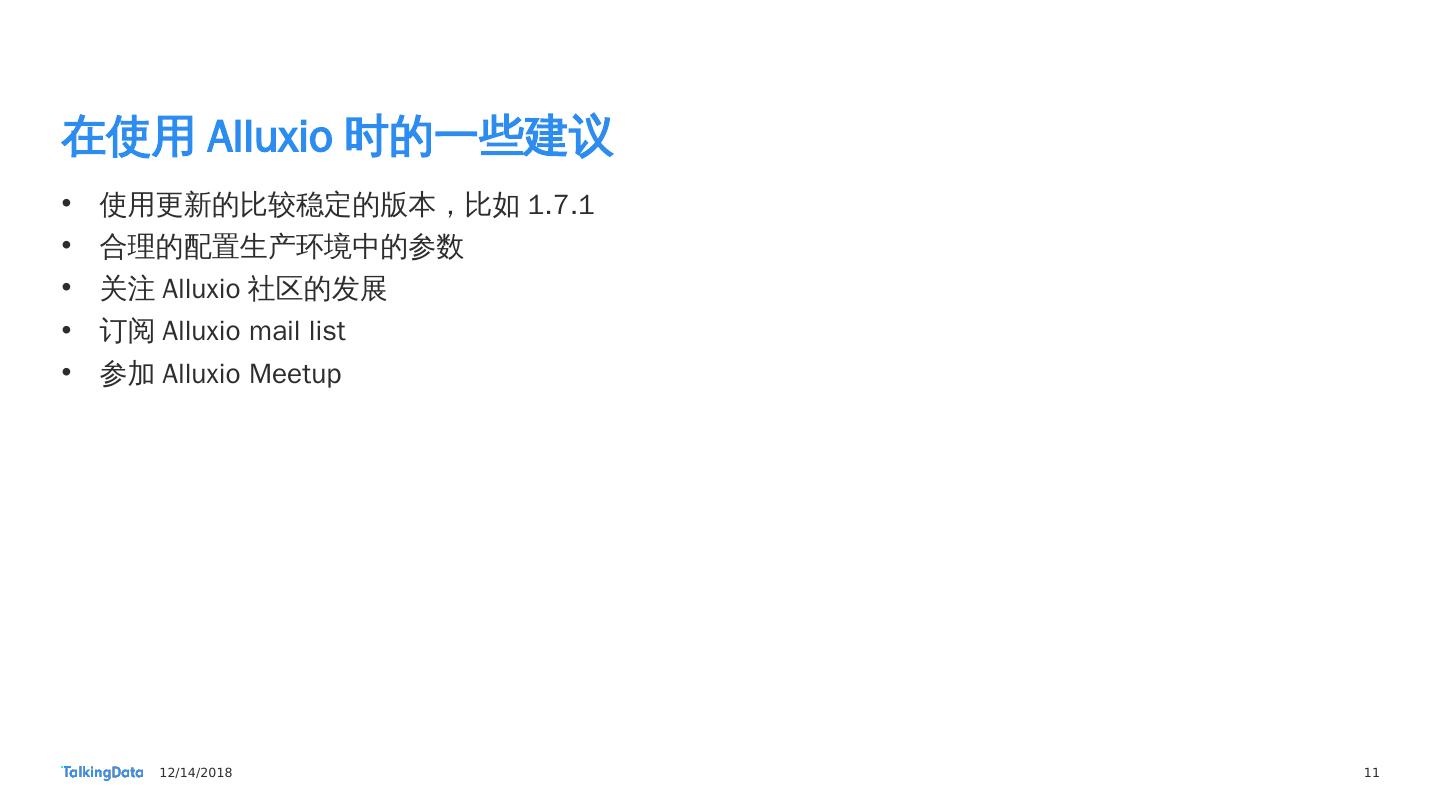 11 .使用更新的比较稳定的版本,比如 1.7.1 合理的配置生产环境中的参数 关注 Alluxio 社区的发展 订阅 Alluxio mail list 参加 Alluxio Meetup 在使用 Alluxio 时的一些建议