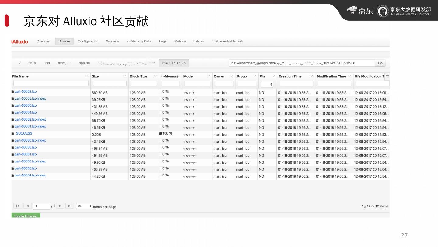 26 .26 JD Contribution ui -grid based sort/ pagnation /filter add an input field New WebUI high watermark start evict low watermark stop evict Watermark evict strategy check startup check every time C onsistency monitor jvm pause Periodically log message and metrics Jvm Pause Monitor cp /ls/load/ rm / format Shell Command DeadLock thrift add timeout time … Bug fix Shell RESTfulApi Change Log Level SyncQuery AlluxioTools … Test 京东对 Alluxio 社区贡献