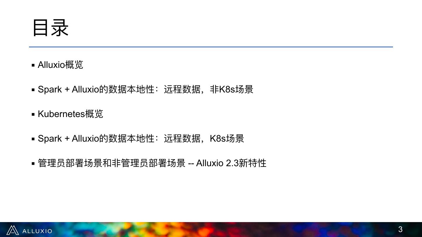 3 .⽬目录 ▪ Alluxio概览 ▪ Spark + Alluxio的数据本地性:远程数据,⾮非K8s场景 ▪ Kubernetes概览 ▪ Spark + Alluxio的数据本地性:远程数据,K8s场景 ▪ 管理理员部署场景和⾮非管理理员部署场景 -- Alluxio 2.3新特性 !3