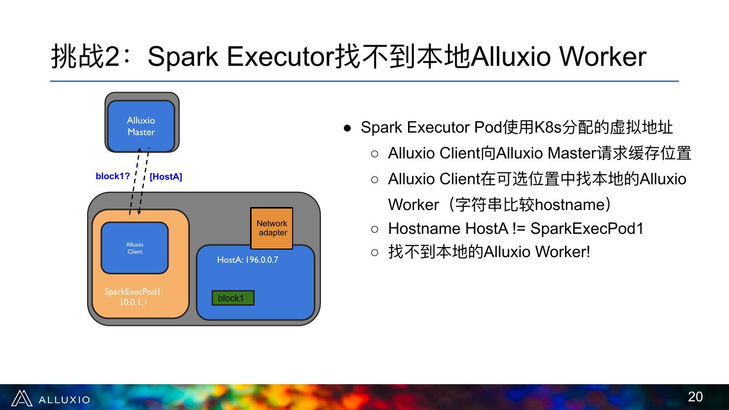 18 . 挑战1: Spark Driver不不知道在哪⾥里里启动Executor Some Node HostA: 196.0.0.7 Alluxio Master Pods AlluxioWorkerPodA: 10.0.1.1 block1? [AlluxioWorkerPodA] block1 Some Node Spark Driver HostB: 196.0.0.8 Application Alluxio Spark Pod Client Context 在[AlluxioWorkerPodA] AlluxioWorkerPodB: 启动Executor? 10.0.1.2 Alluxio Worker Pod地址和物理理机地址不不同 !18