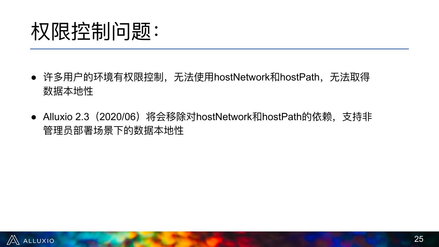 25 .权限控制问题: ● 许多⽤用户的环境有权限控制,⽆无法使⽤用hostNetwork和hostPath,⽆无法取得 数据本地性 ● Alluxio 2.3(2020/06)将会移除对hostNetwork和hostPath的依赖,⽀支持⾮非 管理理员部署场景下的数据本地性 !25