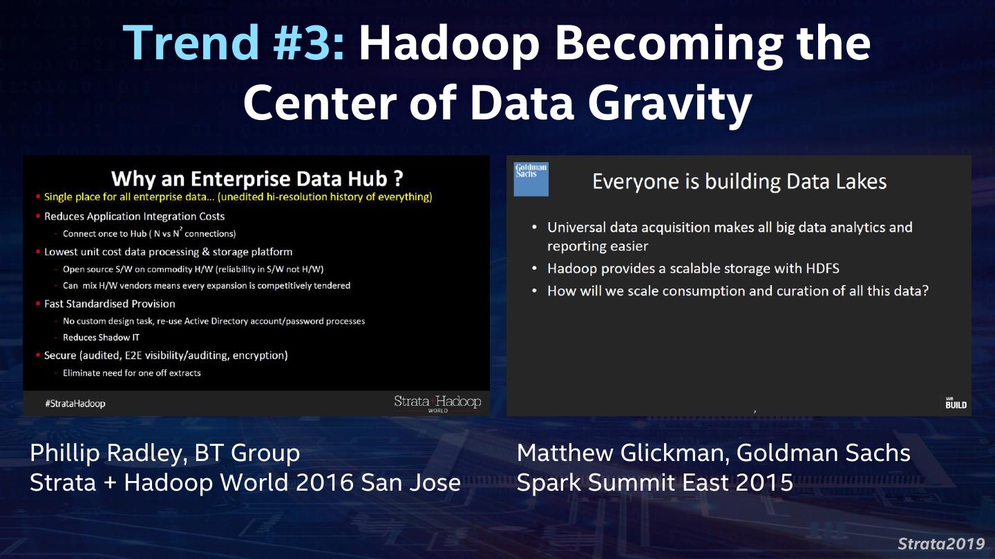 6 . Trend #3: Hadoop Becoming the Center of Data Gravity Phillip Radley, BT Group Matthew Glickman, Goldman Sachs Strata + Hadoop World 2016 San Jose Spark Summit East 2015 Strata2019