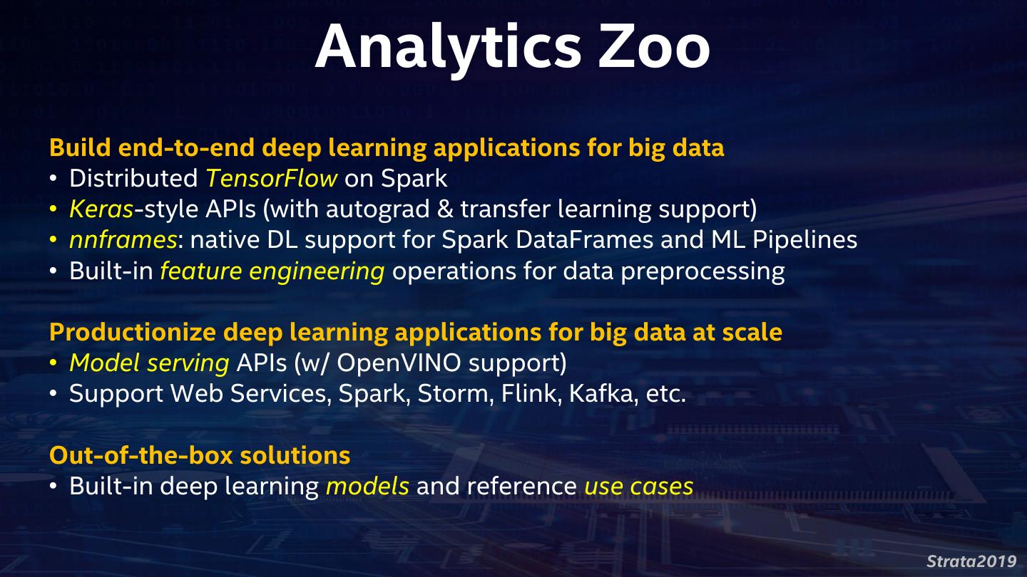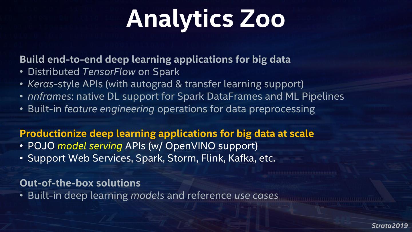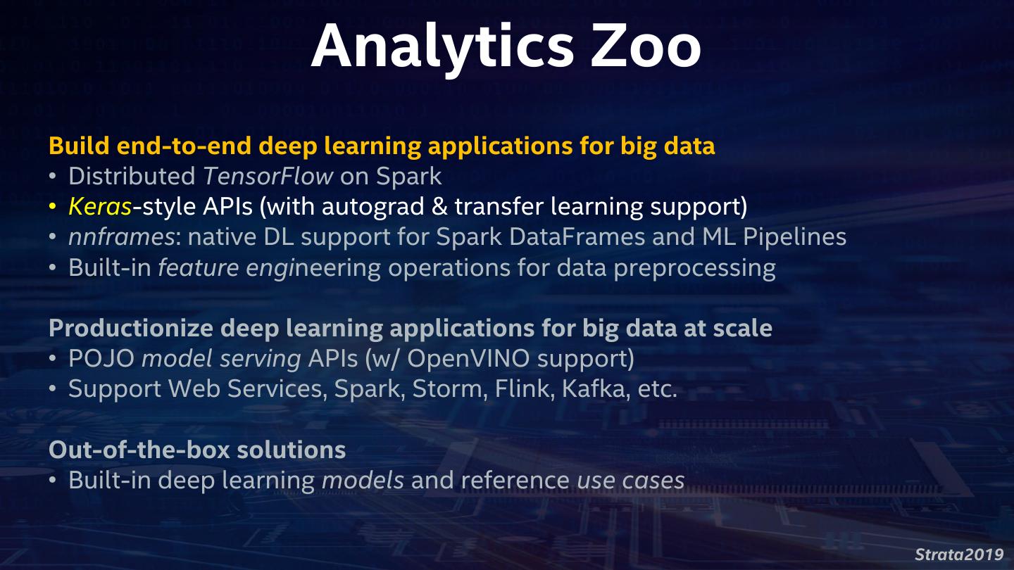 15 . Analytics Zoo A unified analytics + AI platform for distributed TensorFlow, Keras and BigDL on Apache Spark https://github.com/intel-analytics/analytics-zoo Strata2019