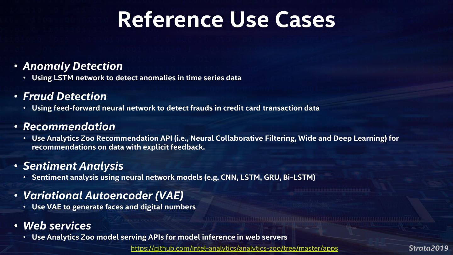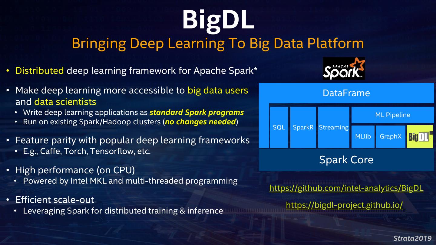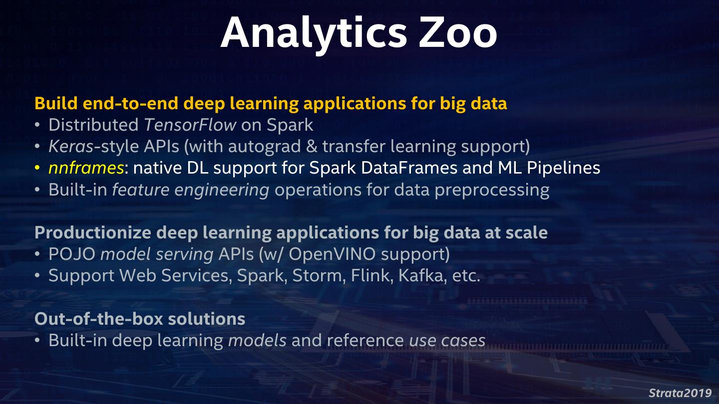 15 . Analytics Zoo A unified analytics + AI platform for distributed TensorFlow, Keras and BigDL on Apache Spark https://github.com/intel-analytics/analytics-zoo Strata2019