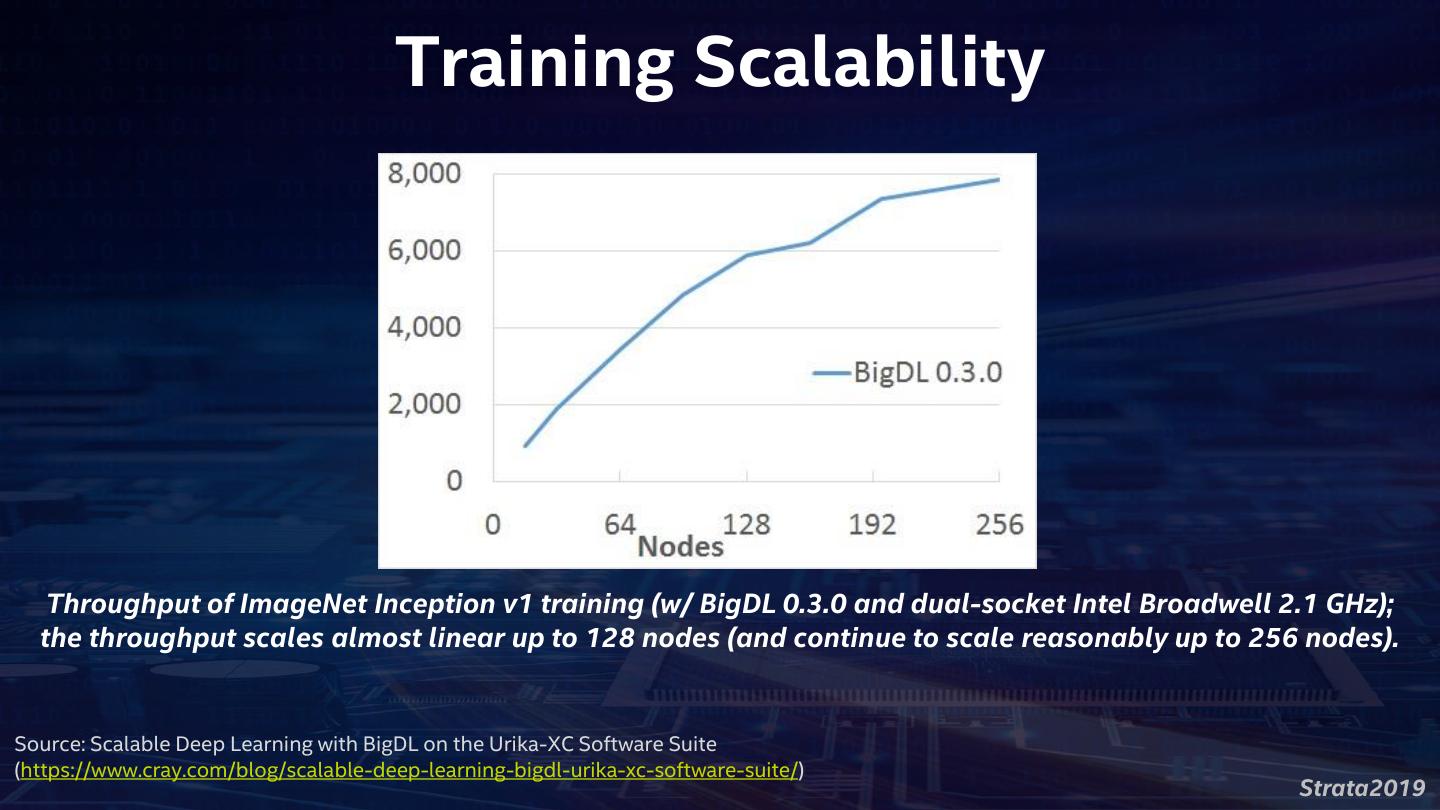 14 . Training Scalability Throughput of ImageNet Inception v1 training (w/ BigDL 0.3.0 and dual-socket Intel Broadwell 2.1 GHz); the throughput scales almost linear up to 128 nodes (and continue to scale reasonably up to 256 nodes). Source: Scalable Deep Learning with BigDL on the Urika-XC Software Suite (https://www.cray.com/blog/scalable-deep-learning-bigdl-urika-xc-software-suite/) Strata2019