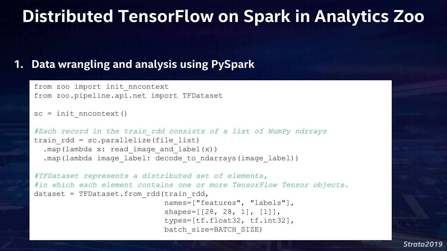 20 . Distributed TensorFlow on Spark in Analytics Zoo 1. Data wrangling and analysis using PySpark from zoo import init_nncontext from zoo.pipeline.api.net import TFDataset sc = init_nncontext() #Each record in the train_rdd consists of a list of NumPy ndrrays train_rdd = sc.parallelize(file_list) .map(lambda x: read_image_and_label(x)) .map(lambda image_label: decode_to_ndarrays(image_label)) #TFDataset represents a distributed set of elements, #in which each element contains one or more TensorFlow Tensor objects. dataset = TFDataset.from_rdd(train_rdd, names=["features", "labels"], shapes=[[28, 28, 1], [1]], types=[tf.float32, tf.int32], batch_size=BATCH_SIZE) Strata2019