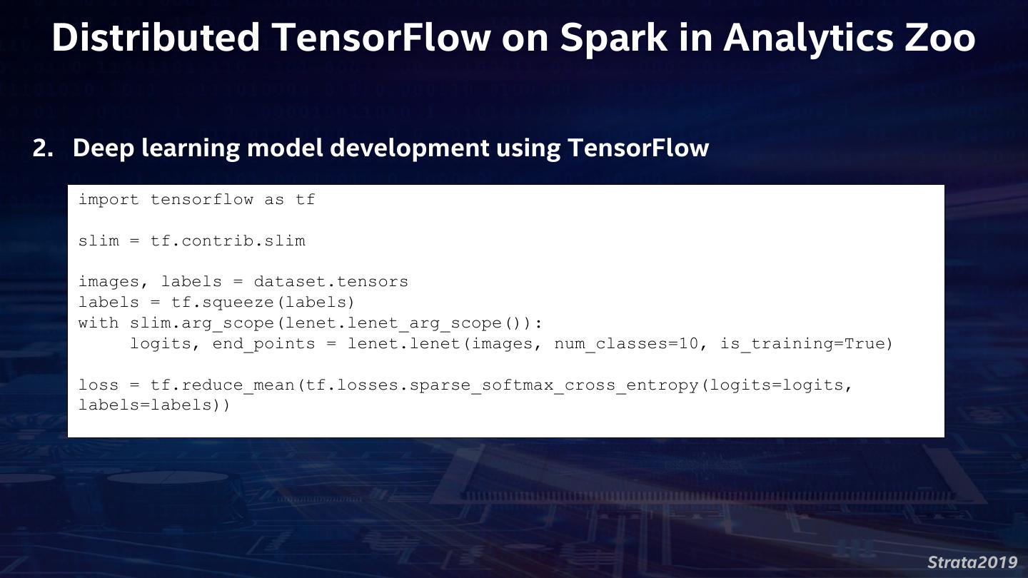 21 . Distributed TensorFlow on Spark in Analytics Zoo 2. Deep learning model development using TensorFlow import tensorflow as tf slim = tf.contrib.slim images, labels = dataset.tensors labels = tf.squeeze(labels) with slim.arg_scope(lenet.lenet_arg_scope()): logits, end_points = lenet.lenet(images, num_classes=10, is_training=True) loss = tf.reduce_mean(tf.losses.sparse_softmax_cross_entropy(logits=logits, labels=labels)) Strata2019