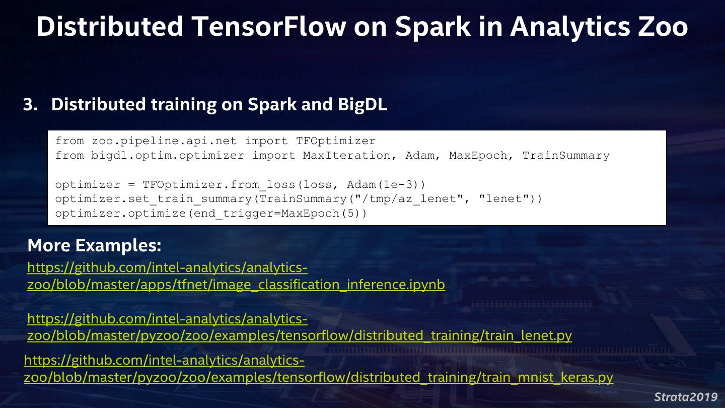 22 . Distributed TensorFlow on Spark in Analytics Zoo 3. Distributed training on Spark and BigDL from zoo.pipeline.api.net import TFOptimizer from bigdl.optim.optimizer import MaxIteration, Adam, MaxEpoch, TrainSummary optimizer = TFOptimizer.from_loss(loss, Adam(1e-3)) optimizer.set_train_summary(TrainSummary("/tmp/az_lenet", "lenet")) optimizer.optimize(end_trigger=MaxEpoch(5)) More Examples: https://github.com/intel-analytics/analytics- zoo/blob/master/apps/tfnet/image_classification_inference.ipynb https://github.com/intel-analytics/analytics- zoo/blob/master/pyzoo/zoo/examples/tensorflow/distributed_training/train_lenet.py https://github.com/intel-analytics/analytics- zoo/blob/master/pyzoo/zoo/examples/tensorflow/distributed_training/train_mnist_keras.py Strata2019