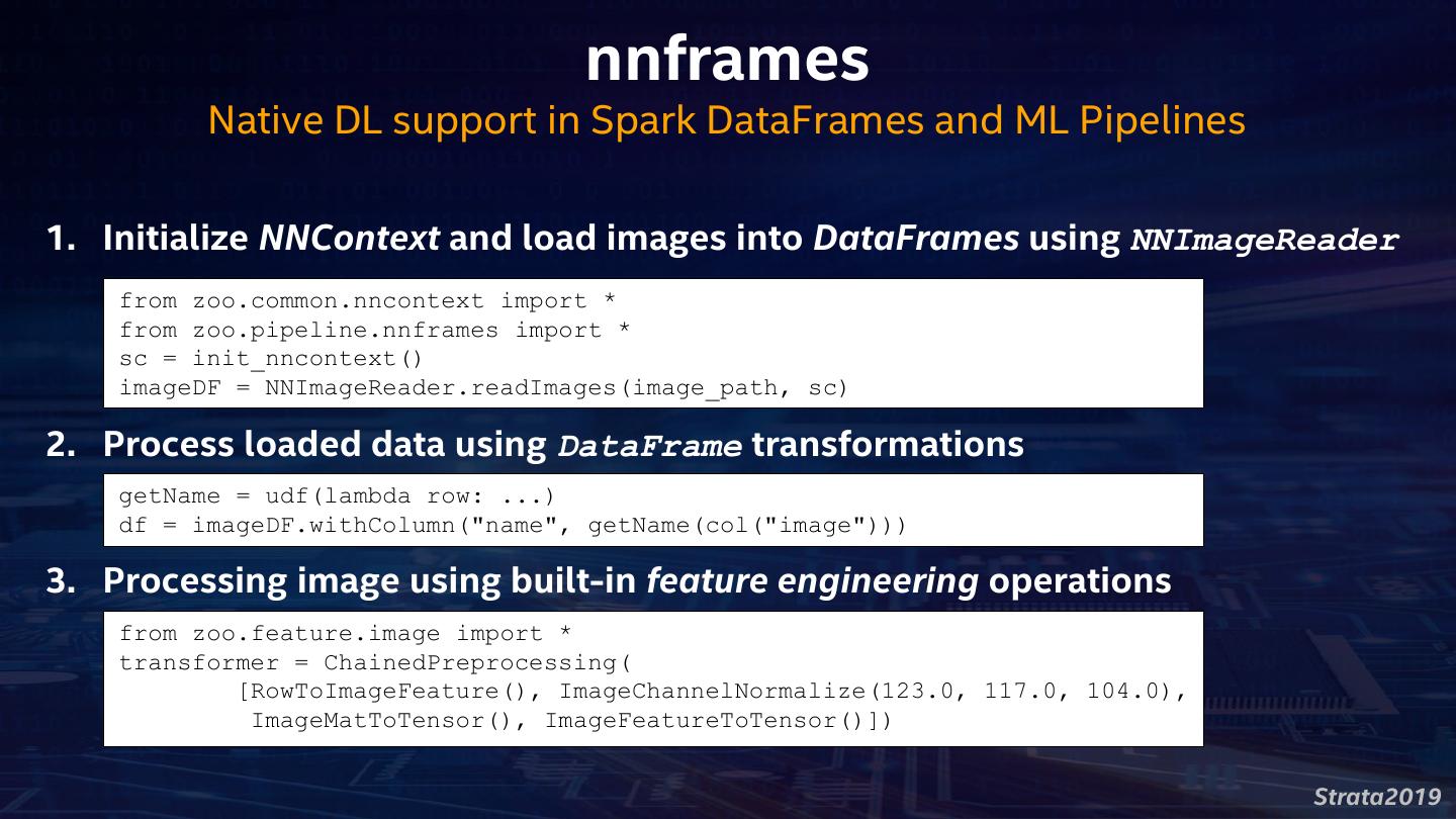 27 . nnframes Native DL support in Spark DataFrames and ML Pipelines 1. Initialize NNContext and load images into DataFrames using NNImageReader from zoo.common.nncontext import * from zoo.pipeline.nnframes import * sc = init_nncontext() imageDF = NNImageReader.readImages(image_path, sc) 2. Process loaded data using DataFrame transformations getName = udf(lambda row: ...) df = imageDF.withColumn("name", getName(col("image"))) 3. Processing image using built-in feature engineering operations from zoo.feature.image import * transformer = ChainedPreprocessing( [RowToImageFeature(), ImageChannelNormalize(123.0, 117.0, 104.0), ImageMatToTensor(), ImageFeatureToTensor()]) Strata2019