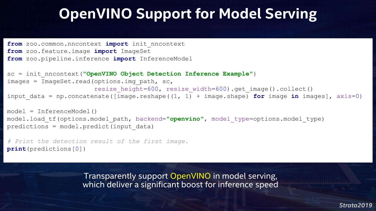 18 . Analytics Zoo Build end-to-end deep learning applications for big data • Distributed TensorFlow on Spark • Keras-style APIs (with autograd & transfer learning support) • nnframes: native DL support for Spark DataFrames and ML Pipelines • Built-in feature engineering operations for data preprocessing Productionize deep learning applications for big data at scale • Model serving APIs (w/ OpenVINO support) • Support Web Services, Spark, Storm, Flink, Kafka, etc. Out-of-the-box solutions • Built-in deep learning models and reference use cases Strata2019