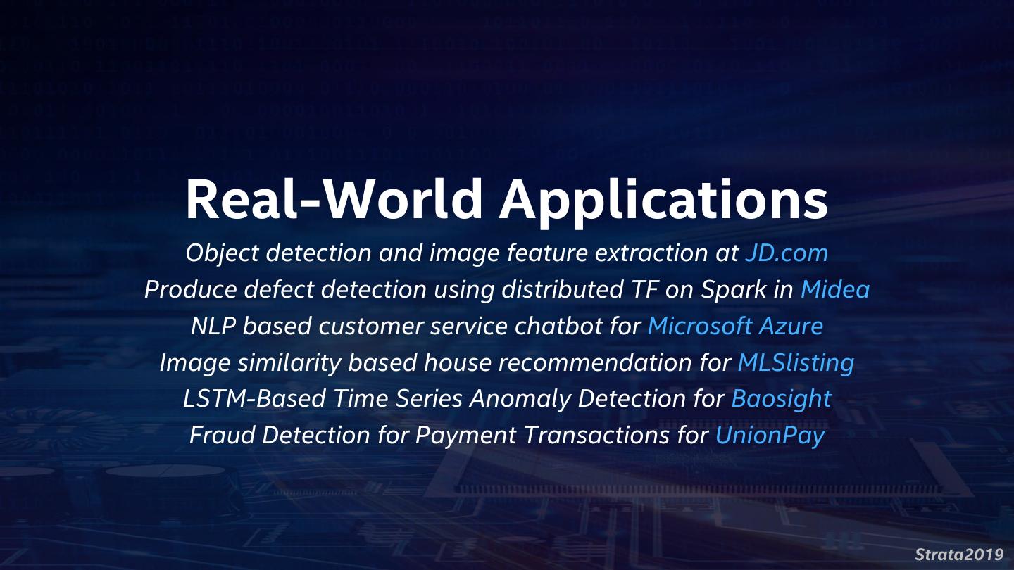 1 .Analytics Zoo: Distributed Tensorflow, Keras and BigDL in production on Apache Spark Jennie Wang, Big Data Technologies, Intel Strata2019