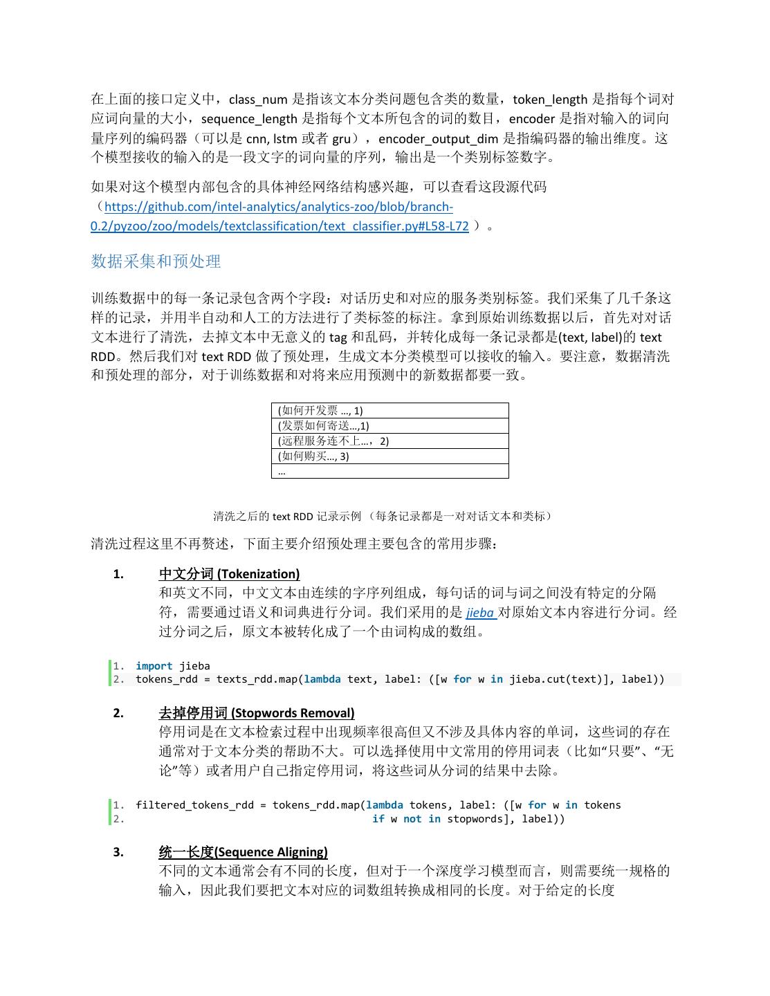 3 .在上面的接口定义中,class_num 是指该文本分类问题包含类的数量,token_length 是指每个词对 应词向量的大小,sequence_length 是指每个文本所包含的词的数目,encoder 是指对输入的词向 量序列的编码器(可以是 cnn, lstm 或者 gru),encoder_output_dim 是指编码器的输出维度。这 个模型接收的输入的是一段文字的词向量的序列,输出是一个类别标签数字。 如果对这个模型内部包含的具体神经网络结构感兴趣,可以查看这段源代码 (https://github.com/intel-analytics/analytics-zoo/blob/branch- 0.2/pyzoo/zoo/models/textclassification/text_classifier.py#L58-L72 )。 数据采集和预处理 训练数据中的每一条记录包含两个字段:对话历史和对应的服务类别标签。我们采集了几千条这 样的记录,并用半自动和人工的方法进行了类标签的标注。拿到原始训练数据以后,首先对对话 文本进行了清洗,去掉文本中无意义的 tag 和乱码,并转化成每一条记录都是(text, label)的 text RDD。然后我们对 text RDD 做了预处理,生成文本分类模型可以接收的输入。要注意,数据清洗 和预处理的部分,对于训练数据和对将来应用预测中的新数据都要一致。 (如何开发票 …, 1) (发票如何寄送…,1) (远程服务连不上…,2) (如何购买…, 3) … 清洗之后的 text RDD 记录示例 (每条记录都是一对对话文本和类标) 清洗过程这里不再赘述,下面主要介绍预处理主要包含的常用步骤: 1. 中文分词 (Tokenization) 和英文不同,中文文本由连续的字序列组成,每句话的词与词之间没有特定的分隔 符,需要通过语义和词典进行分词。我们采用的是 jieba 对原始文本内容进行分词。经 过分词之后,原文本被转化成了一个由词构成的数组。 1. import jieba 2. tokens_rdd = texts_rdd.map(lambda text, label: ([w for w in jieba.cut(text)], label)) 2. 去掉停用词 (Stopwords Removal) 停用词是在文本检索过程中出现频率很高但又不涉及具体内容的单词,这些词的存在 通常对于文本分类的帮助不大。可以选择使用中文常用的停用词表(比如“只要”、“无 论”等)或者用户自己指定停用词,将这些词从分词的结果中去除。 1. filtered_tokens_rdd = tokens_rdd.map(lambda tokens, label: ([w for w in tokens 2. if w not in stopwords], label)) 3. 统一长度(Sequence Aligning) 不同的文本通常会有不同的长度,但对于一个深度学习模型而言,则需要统一规格的 输入,因此我们要把文本对应的词数组转换成相同的长度。对于给定的长度