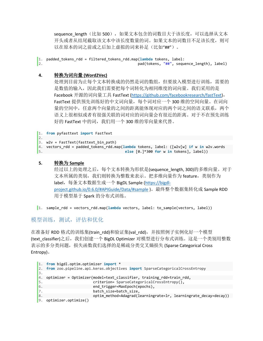4 . sequence_length(比如 500),如果文本包含的词数目大于该长度,可以选择从文本 开头或者从结尾截取该文本中该长度数量的词。如果文本的词数目不足该长度,则可 以在原本的词之前或之后加上虚拟的词来补足(比如“##”)。 1. padded_tokens_rdd = filtered_tokens_rdd.map(lambda tokens, label: 2. pad(tokens, "##", sequence_length), label) 4. 转换为词向量 (Word2Vec) 处理到目前为止每个文本转换成的仍然是词的数组,但要放入模型进行训练,需要的 是数值的输入,因此我们需要把每个词转化为相同维度的词向量。我们采用的是 Facebook 开源的词向量工具 FastText (https://github.com/facebookresearch/fastText), FastText 提供预先训练好的中文词向量,每个词对应一个 300 维的空间向量。在词向 量的空间中,任意两个向量的之间的距离能体现对应的两个词之间的语义联系,两个 语义上很相似或者有很强关联的词对应的词向量会有很近的距离。对于不在预先训练 好的 FastText 中的词,我们用一个 300 维的零向量来代替。 1. from pyfasttext import FastText 2. 3. w2v = FastText(fasttext_bin_path) 4. vectors_rdd = padded_tokens_rdd.map(lambda tokens, label: ([w2v[w] if w in w2v.words 5. else [0.]*300 for w in tokens], label)) 5. 转换为 Sample 经过以上的处理之后,每个文本转换为形状是(sequence_length, 300)的多维向量。对于 文本所属的类别,我们则转换为整数来表示。把多维向量作为 feature,类别作为 label,每条文本数据生成一个 BigDL Sample (https://bigdl- project.github.io/0.6.0/#APIGuide/Data/#sample )。最终整个数据集转化成 Sample RDD 用于模型基于 Spark 的分布式训练。 1. sample_rdd = vectors_rdd.map(lambda vectors, label: to_sample(vectors, label)) 模型训练,测试,评估和优化 在准备好 RDD 格式的训练集(train_rdd)和验证集(val_rdd),并按照例子实例化好一个模型 (text_classifier)之后,我们创建一个 BigDL Optimizer 对模型进行分布式训练。这是一个类别用整数 表示的多分类问题,损失函数我们选择的是稀疏分类交叉熵损失 (Sparse Categorical Cross Entropy)。 1. from bigdl.optim.optimizer import * 2. from zoo.pipeline.api.keras.objectives import SparseCategoricalCrossEntropy 3. 4. optimizer = Optimizer(model=text_classifier, training_rdd=train_rdd, 5. criterion= SparseCategoricalCrossEntropy(), 6. end_trigger=MaxEpoch(epochs), 7. batch_size=batch_size, 8. optim_method=Adagrad(learningrate=lr, learningrate_decay=decay)) 9. optimizer.optimize()