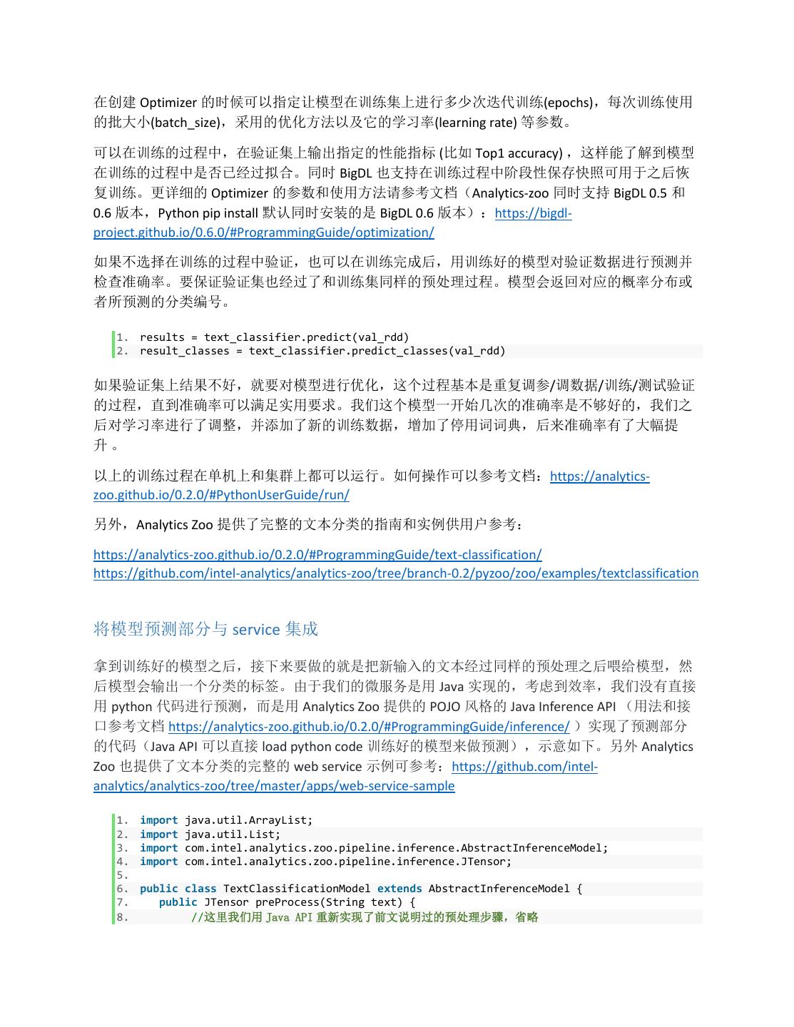 5 .在创建 Optimizer 的时候可以指定让模型在训练集上进行多少次迭代训练(epochs),每次训练使用 的批大小(batch_size),采用的优化方法以及它的学习率(learning rate) 等参数。 可以在训练的过程中,在验证集上输出指定的性能指标 (比如 Top1 accuracy) ,这样能了解到模型 在训练的过程中是否已经过拟合。同时 BigDL 也支持在训练过程中阶段性保存快照可用于之后恢 复训练。更详细的 Optimizer 的参数和使用方法请参考文档(Analytics-zoo 同时支持 BigDL 0.5 和 0.6 版本,Python pip install 默认同时安装的是 BigDL 0.6 版本):https://bigdl- project.github.io/0.6.0/#ProgrammingGuide/optimization/ 如果不选择在训练的过程中验证,也可以在训练完成后,用训练好的模型对验证数据进行预测并 检查准确率。要保证验证集也经过了和训练集同样的预处理过程。模型会返回对应的概率分布或 者所预测的分类编号。 1. results = text_classifier.predict(val_rdd) 2. result_classes = text_classifier.predict_classes(val_rdd) 如果验证集上结果不好,就要对模型进行优化,这个过程基本是重复调参/调数据/训练/测试验证 的过程,直到准确率可以满足实用要求。我们这个模型一开始几次的准确率是不够好的,我们之 后对学习率进行了调整,并添加了新的训练数据,增加了停用词词典,后来准确率有了大幅提 升。 以上的训练过程在单机上和集群上都可以运行。如何操作可以参考文档:https://analytics- zoo.github.io/0.2.0/#PythonUserGuide/run/ 另外,Analytics Zoo 提供了完整的文本分类的指南和实例供用户参考: https://analytics-zoo.github.io/0.2.0/#ProgrammingGuide/text-classification/ https://github.com/intel-analytics/analytics-zoo/tree/branch-0.2/pyzoo/zoo/examples/textclassification 将模型预测部分与 service 集成 拿到训练好的模型之后,接下来要做的就是把新输入的文本经过同样的预处理之后喂给模型,然 后模型会输出一个分类的标签。由于我们的微服务是用 Java 实现的,考虑到效率,我们没有直接 用 python 代码进行预测,而是用 Analytics Zoo 提供的 POJO 风格的 Java Inference API (用法和接 口参考文档 https://analytics-zoo.github.io/0.2.0/#ProgrammingGuide/inference/ )实现了预测部分 的代码(Java API 可以直接 load python code 训练好的模型来做预测),示意如下。另外 Analytics Zoo 也提供了文本分类的完整的 web service 示例可参考:https://github.com/intel- analytics/analytics-zoo/tree/master/apps/web-service-sample 1. import java.util.ArrayList; 2. import java.util.List; 3. import com.intel.analytics.zoo.pipeline.inference.AbstractInferenceModel; 4. import com.intel.analytics.zoo.pipeline.inference.JTensor; 5. 6. public class TextClassificationModel extends AbstractInferenceModel { 7. public JTensor preProcess(String text) { 8. //这里我们用 Java API 重新实现了前文说明过的预处理步骤,省略