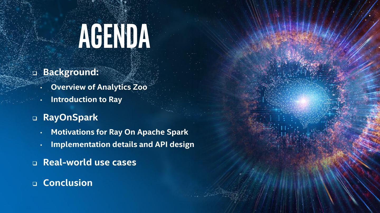 3 . Agenda ❑ Background: • Overview of Analytics Zoo • Introduction to Ray ❑ RayOnSpark • Motivations for Ray On Apache Spark • Implementation details and API design ❑ Real-world use cases ❑ Conclusion