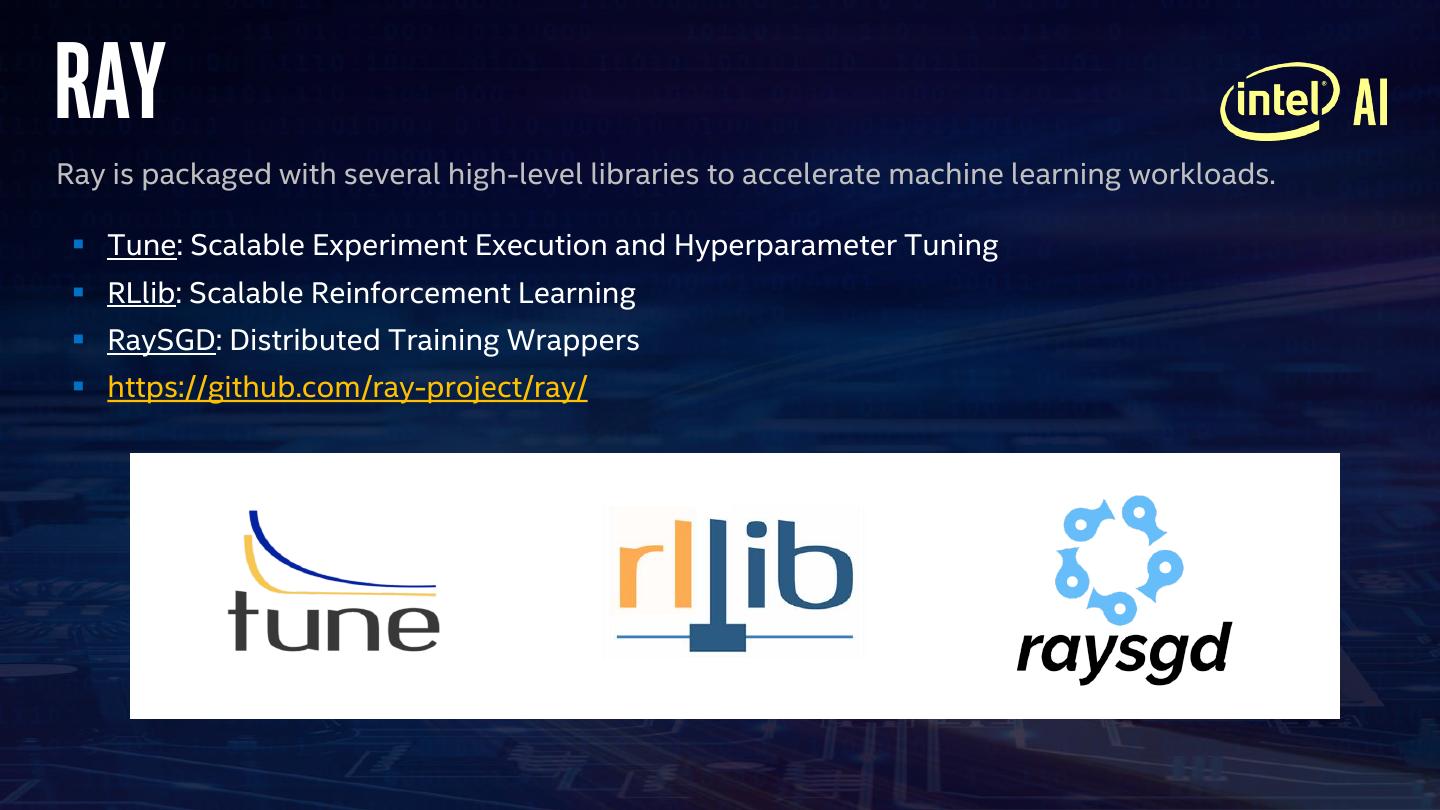 8 .Ray Ray is packaged with several high-level libraries to accelerate machine learning workloads. ▪ Tune: Scalable Experiment Execution and Hyperparameter Tuning ▪ RLlib: Scalable Reinforcement Learning ▪ RaySGD: Distributed Training Wrappers ▪ https://github.com/ray-project/ray/