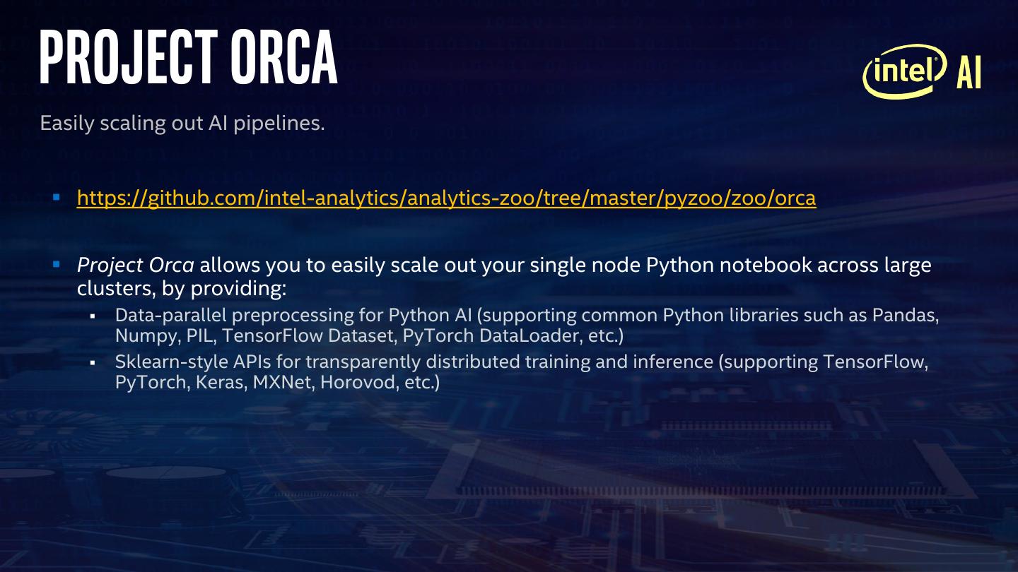13 .Project ORCA Easily scaling out AI pipelines. ▪ https://github.com/intel-analytics/analytics-zoo/tree/master/pyzoo/zoo/orca ▪ Project Orca allows you to easily scale out your single node Python notebook across large clusters, by providing: ▪ Data-parallel preprocessing for Python AI (supporting common Python libraries such as Pandas, Numpy, PIL, TensorFlow Dataset, PyTorch DataLoader, etc.) ▪ Sklearn-style APIs for transparently distributed training and inference (supporting TensorFlow, PyTorch, Keras, MXNet, Horovod, etc.)