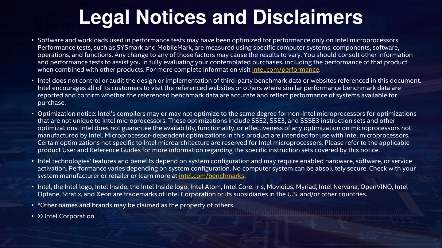 18 . Legal Notices and Disclaimers • Software and workloads used in performance tests may have been optimized for performance only on Intel microprocessors. Performance tests, such as SYSmark and MobileMark, are measured using specific computer systems, components, software, operations, and functions. Any change to any of those factors may cause the results to vary. You should consult other information and performance tests to assist you in fully evaluating your contemplated purchases, including the performance of that product when combined with other products. For more complete information visit intel.com/performance. • Intel does not control or audit the design or implementation of third-party benchmark data or websites referenced in this document. Intel encourages all of its customers to visit the referenced websites or others where similar performance benchmark data are reported and confirm whether the referenced benchmark data are accurate and reflect performance of systems available for purchase. • Optimization notice: Intel’s compilers may or may not optimize to the same degree for non-Intel microprocessors for optimizations that are not unique to Intel microprocessors. These optimizations include SSE2, SSE3, and SSSE3 instruction sets and other optimizations. Intel does not guarantee the availability, functionality, or effectiveness of any optimization on microprocessors not manufactured by Intel. Microprocessor-dependent optimizations in this product are intended for use with Intel microprocessors. Certain optimizations not specific to Intel microarchitecture are reserved for Intel microprocessors. Please refer to the applicable product User and Reference Guides for more information regarding the specific instruction sets covered by this notice. • Intel technologies’ features and benefits depend on system configuration and may require enabled hardware, software, or service activation. Performance varies depending on system configuration. No computer system can be absolutely secure. Check with your system manufacturer or retailer or learn more at intel.com/benchmarks. • Intel, the Intel logo, Intel Inside, the Intel Inside logo, Intel Atom, Intel Core, Iris, Movidius, Myriad, Intel Nervana, OpenVINO, Intel Optane, Stratix, and Xeon are trademarks of Intel Corporation or its subsidiaries in the U.S. and/or other countries. • *Other names and brands may be claimed as the property of others. • © Intel Corporation