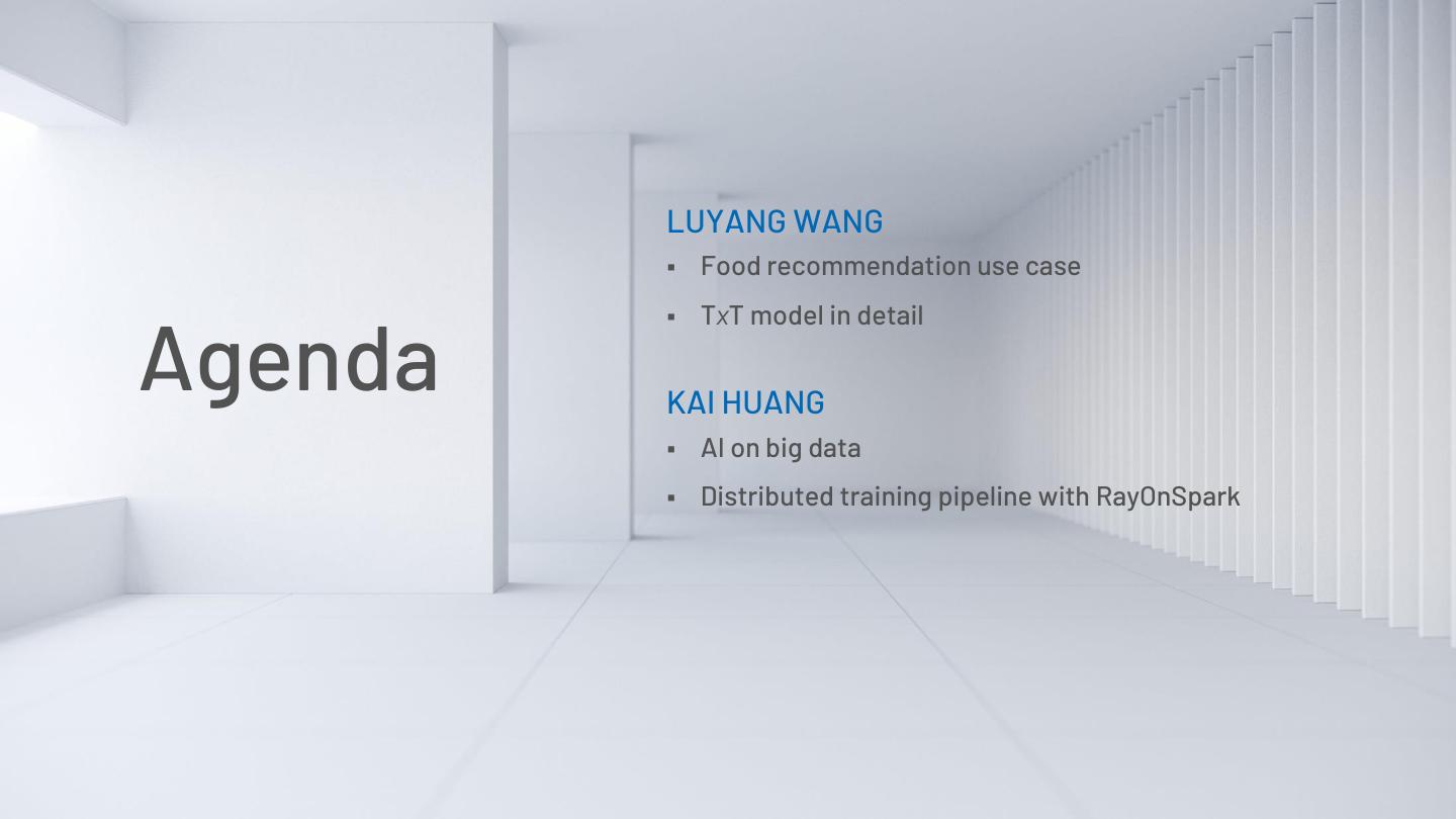 3 . LUYANG WANG ▪ Food recommendation use case TxT model in detail Agenda ▪ KAI HUANG ▪ AI on big data ▪ Distributed training pipeline with RayOnSpark