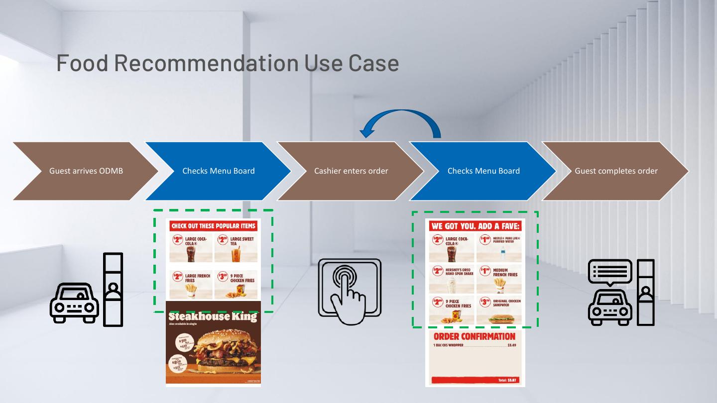 5 . Food Recommendation Use Case Guest arrives ODMB Checks Menu Board Cashier enters order Checks Menu Board Guest completes order