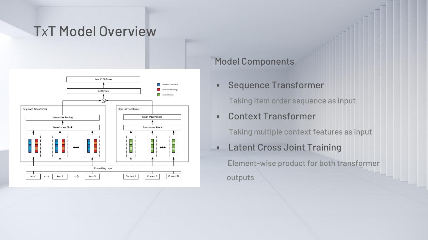 10 .TxT Model Overview Model Components ▪ Sequence Transformer Taking item order sequence as input ▪ Context Transformer Taking multiple context features as input ▪ Latent Cross Joint Training Element-wise product for both transformer outputs