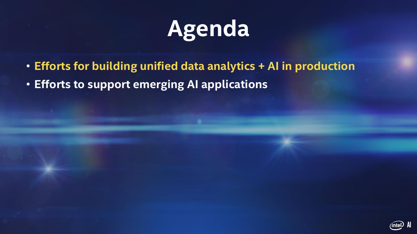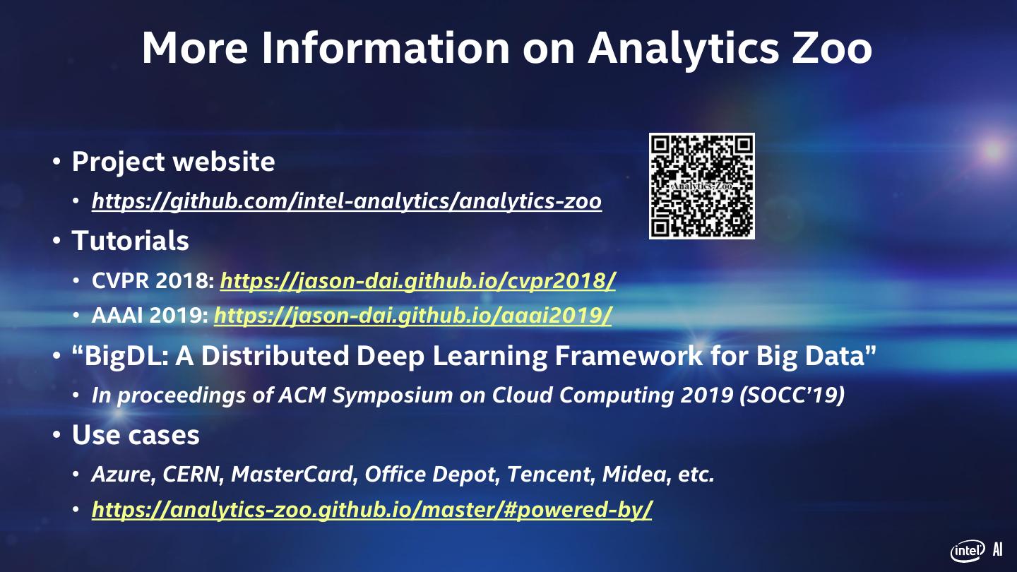 1 . Distributed, High-Performance Unified Analytics + AI Platform Deep Learning Framework Distributed TensorFlow, Keras, PyTorch and BigDL for Apache Spark on Apache Spark https://github.com/intel-analytics/bigdl https://github.com/intel-analytics/analytics-zoo Accelerating Data Analytics + AI Solutions At Scale AI