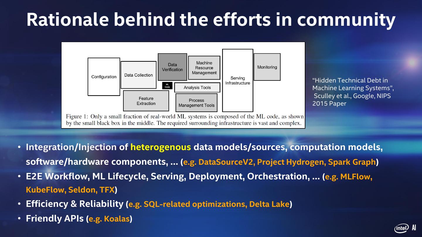 6 . Rationale behind the efforts in community “Hidden Technical Debt in Machine Learning Systems”, Sculley et al., Google, NIPS 2015 Paper • Integration/Injection of heterogenous data models/sources, computation models, software/hardware components, … (e.g. DataSourceV2, Project Hydrogen, Spark Graph) • E2E Workflow, ML Lifecycle, Serving, Deployment, Orchestration, … (e.g. MLFlow, KubeFlow, Seldon, TFX) • Efficiency & Reliability (e.g. SQL-related optimizations, Delta Lake) • Friendly APIs (e.g. Koalas) AI