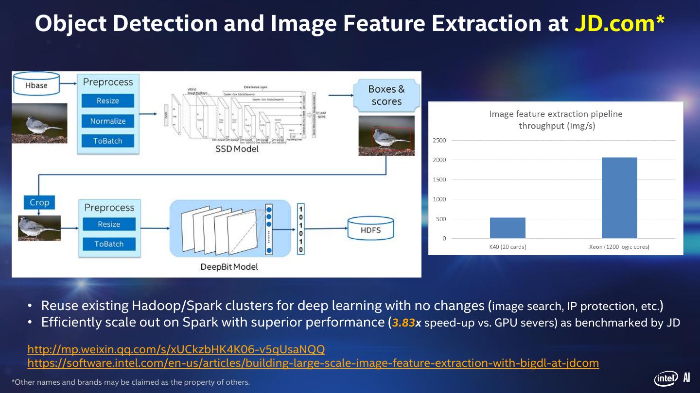 10 . Object Detection and Image Feature Extraction at JD.com* • Reuse existing Hadoop/Spark clusters for deep learning with no changes (image search, IP protection, etc.) • Efficiently scale out on Spark with superior performance (3.83x speed-up vs. GPU severs) as benchmarked by JD http://mp.weixin.qq.com/s/xUCkzbHK4K06-v5qUsaNQQ https://software.intel.com/en-us/articles/building-large-scale-image-feature-extraction-with-bigdl-at-jdcom *Other names and brands may be claimed as the property of others. AI