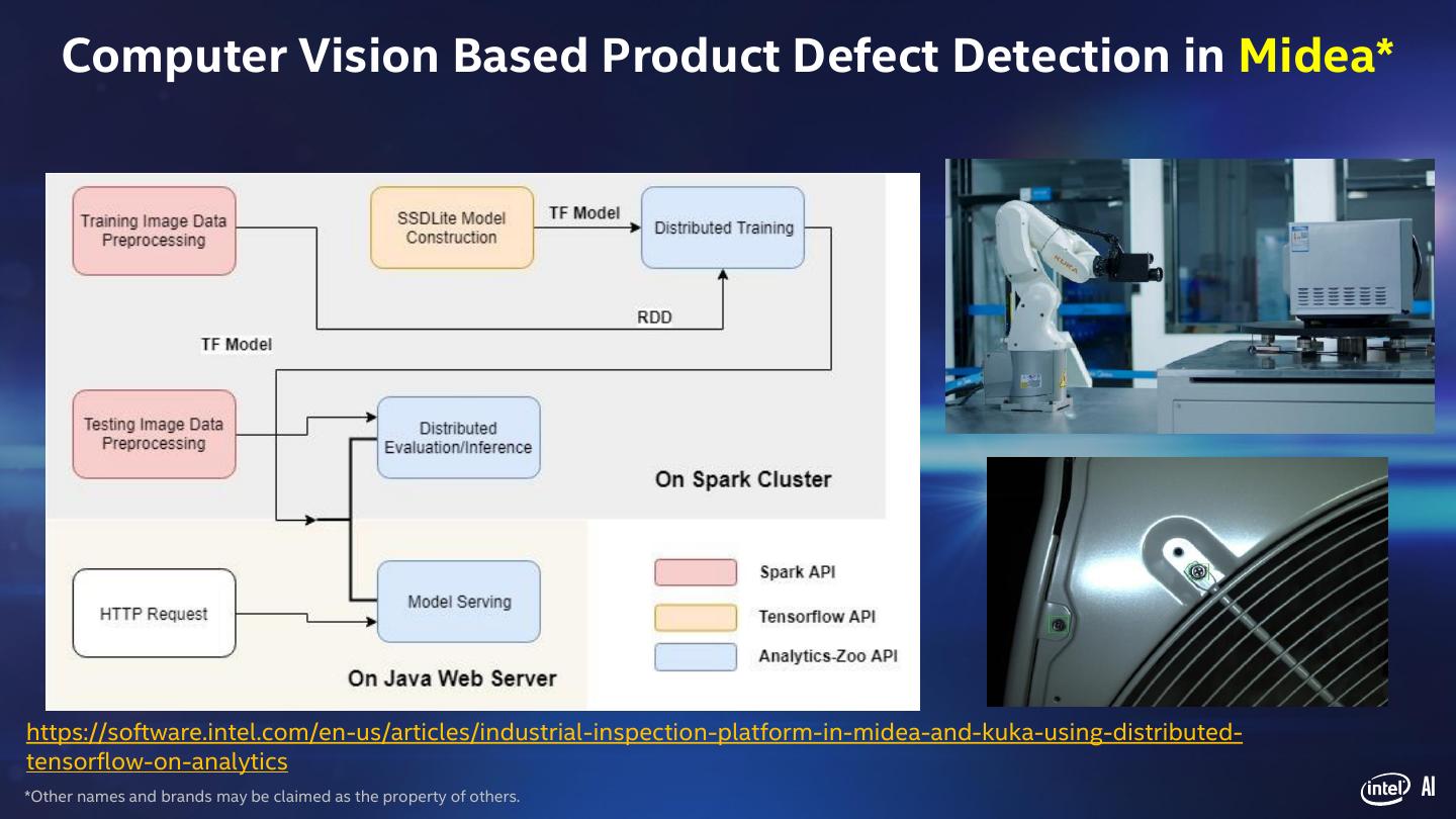 12 . Computer Vision Based Product Defect Detection in Midea* https://software.intel.com/en-us/articles/industrial-inspection-platform-in-midea-and-kuka-using-distributed- tensorflow-on-analytics *Other names and brands may be claimed as the property of others. AI