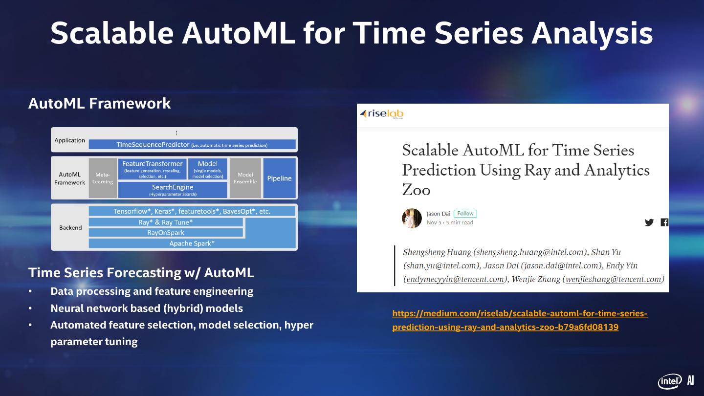 20 . Scalable AutoML for Time Series Analysis AutoML Framework Time Series Forecasting w/ AutoML • Data processing and feature engineering • Neural network based (hybrid) models https://medium.com/riselab/scalable-automl-for-time-series- • Automated feature selection, model selection, hyper prediction-using-ray-and-analytics-zoo-b79a6fd08139 parameter tuning AI