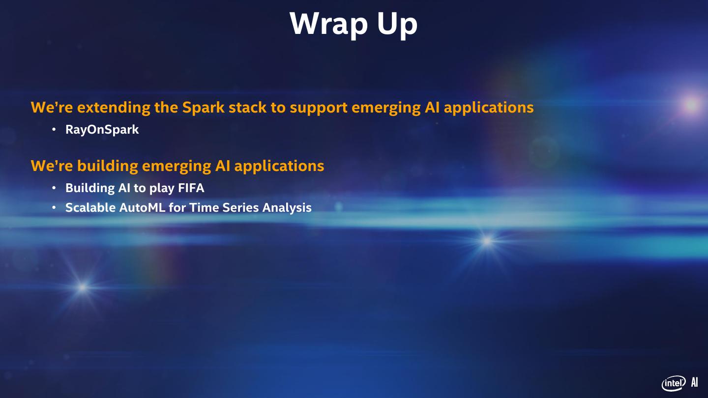 21 . Wrap Up We’re extending the Spark stack to support emerging AI applications • RayOnSpark We’re building emerging AI applications • Building AI to play FIFA • Scalable AutoML for Time Series Analysis AI