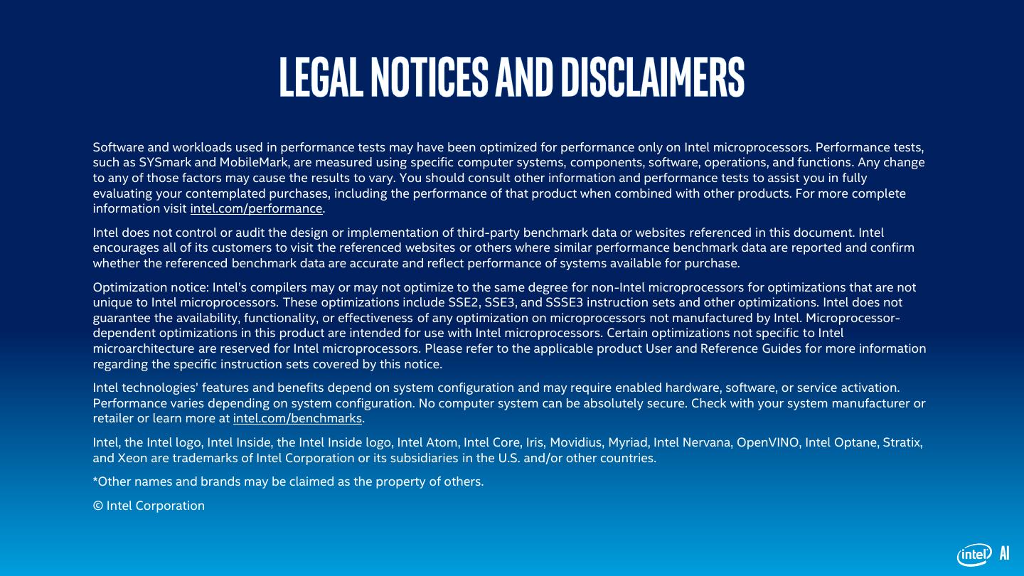24 .Software and workloads used in performance tests may have been optimized for performance only on Intel microprocessors. Performance tests, such as SYSmark and MobileMark, are measured using specific computer systems, components, software, operations, and functions. Any change to any of those factors may cause the results to vary. You should consult other information and performance tests to assist you in fully evaluating your contemplated purchases, including the performance of that product when combined with other products. For more complete information visit intel.com/performance. Intel does not control or audit the design or implementation of third-party benchmark data or websites referenced in this document. Intel encourages all of its customers to visit the referenced websites or others where similar performance benchmark data are reported and confirm whether the referenced benchmark data are accurate and reflect performance of systems available for purchase. Optimization notice: Intel’s compilers may or may not optimize to the same degree for non-Intel microprocessors for optimizations that are not unique to Intel microprocessors. These optimizations include SSE2, SSE3, and SSSE3 instruction sets and other optimizations. Intel does not guarantee the availability, functionality, or effectiveness of any optimization on microprocessors not manufactured by Intel. Microprocessor- dependent optimizations in this product are intended for use with Intel microprocessors. Certain optimizations not specific to Intel microarchitecture are reserved for Intel microprocessors. Please refer to the applicable product User and Reference Guides for more information regarding the specific instruction sets covered by this notice. Intel technologies’ features and benefits depend on system configuration and may require enabled hardware, software, or service activation. Performance varies depending on system configuration. No computer system can be absolutely secure. Check with your system manufacturer or retailer or learn more at intel.com/benchmarks. Intel, the Intel logo, Intel Inside, the Intel Inside logo, Intel Atom, Intel Core, Iris, Movidius, Myriad, Intel Nervana, OpenVINO, Intel Optane, Stratix, and Xeon are trademarks of Intel Corporation or its subsidiaries in the U.S. and/or other countries. *Other names and brands may be claimed as the property of others. © Intel Corporation AI