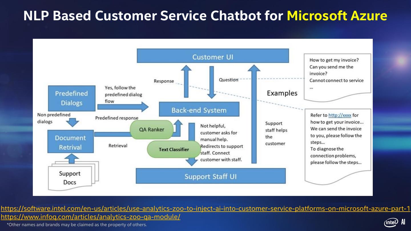 25 . NLP Based Customer Service Chatbot for Microsoft Azure https://software.intel.com/en-us/articles/use-analytics-zoo-to-inject-ai-into-customer-service-platforms-on-microsoft-azure-part-1 https://www.infoq.com/articles/analytics-zoo-qa-module/ *Other names and brands may be claimed as the property of others. AI