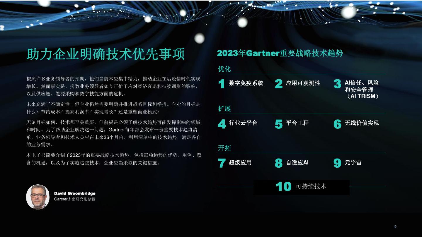 2 .助力企业明确技术优先事项 2023年Gartner重要战略技术趋势 优化 1 数字免疫系统 2 应用可观测性 3 AI信任、风险 按照许多业务领导者的预期,他们当前本应集中精力,推动企业在后疫情时代实现 增长。然而事实是,多数业务领导者如今正忙于应对经济衰退和持续通胀的影响, 和安全管理 以及供应链、能源采购和数字技能方面的危机。 (AI TRiSM) 未来充满了不确定性,但企业仍然需要明确并推进战略目标和举措。企业的目标是 什么?节约成本?提高利润率?实现增长?还是重塑商业模式? 扩展 无论目标如何,技术都至关重要,但前提是必须了解技术趋势可能发挥影响的领域 和时间。为了帮助企业解决这一问题,Gartner每年都会发布一份重要技术趋势清 4 行业云平台 5 平台工程 6 无线价值实现 单,业务领导者和技术人员应在未来36个月内,利用清单中的技术趋势,满足各自 的业务需求。 开拓 本电子书简要介绍了2023年的重要战略技术趋势,包括每项趋势的优势、用例、蕴 含的机遇,以及为了实施这些技术,企业应当采取的关键措施。 7 超级应用 8 自适应AI 9 元宇宙 David Groombridge 10 可持续技术 Gartner杰出研究副总裁
