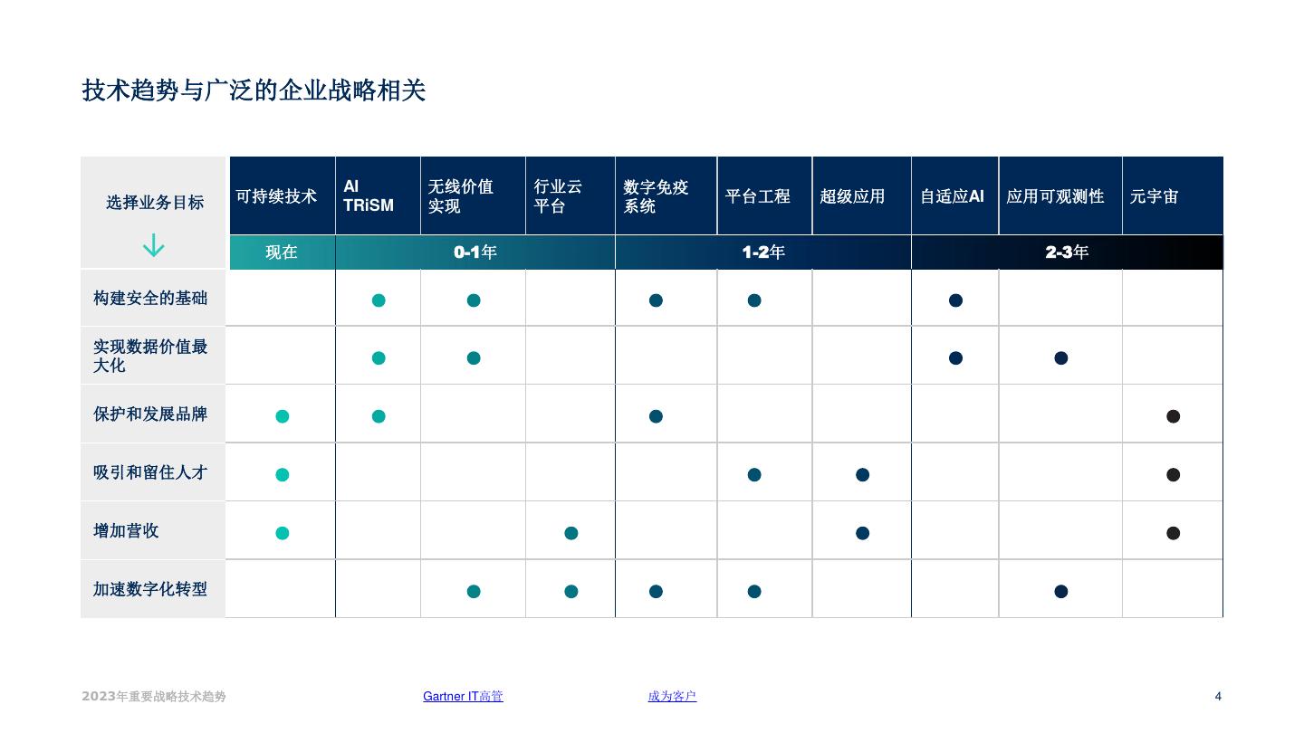 3 .透过战略目标看技术 要了解如何利用这些技术趋势提升企业价值,首先需要了解企业自身的战略目标。 例如,Gartner的研究表明,94%的CEO希望继续或加速推进疫情驱动的数字化转型进程。 而后,企业需要确定哪些技术与自身最为相关,同时认识到,不是所有的技术都需要立刻 予以实施。 以此,企业便迈出了制定战略技术路线图的第一步。 以加速数字化转型转型为目标的战略技术路线图,可能包含以下技术趋势 AI 可持续技术 无线价值实现 行业云平台 数字免疫系统 平台工程 超级应用 自适应AI 应用可观测性 元宇宙 TRiSM 现在 0-1年 1-2年 2-3年 2023年重要战略技术趋势 Gartner IT高管 成为客户 3