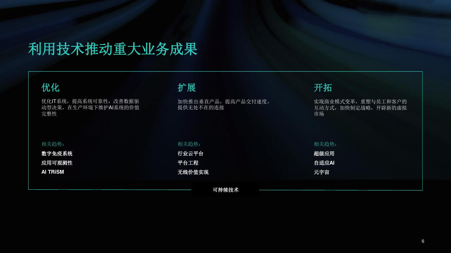 6 .优化 扩展 开拓 数字免疫系统 行业云平台 超级应用 应用可观测性 平台工程 自适应AI AI TRiSM 无线价值实现 元宇宙 可持续技术