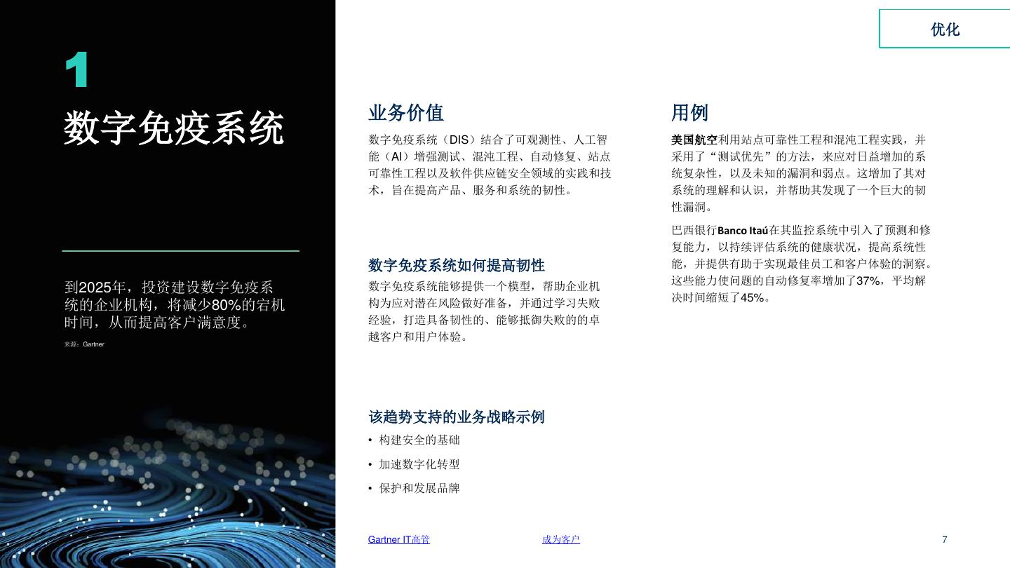 7 . 优化 1 业务价值 用例 数字免疫系统 数字免疫系统(DIS)结合了可观测性、人工智 美国航空利用站点可靠性工程和混沌工程实践,并 能(AI)增强测试、混沌工程、自动修复、站点 采用了“测试优先”的方法,来应对日益增加的系 可靠性工程以及软件供应链安全领域的实践和技 统复杂性,以及未知的漏洞和弱点。这增加了其对 术,旨在提高产品、服务和系统的韧性。 系统的理解和认识,并帮助其发现了一个巨大的韧 性漏洞。 巴西银行Banco Itaú在其监控系统中引入了预测和修 复能力,以持续评估系统的健康状况,提高系统性 数字免疫系统如何提高韧性 能,并提供有助于实现最佳员工和客户体验的洞察。 这些能力使问题的自动修复率增加了37%,平均解 到2025年,投资建设数字免疫系 数字免疫系统能够提供一个模型,帮助企业机 决时间缩短了45%。 统的企业机构,将减少80%的宕机 构为应对潜在风险做好准备,并通过学习失败 时间,从而提高客户满意度。 经验,打造具备韧性的、能够抵御失败的的卓 来源:Gartner 越客户和用户体验。 该趋势支持的业务战略示例 • 构建安全的基础 • 加速数字化转型 • 保护和发展品牌 Gartner IT高管 成为客户 7