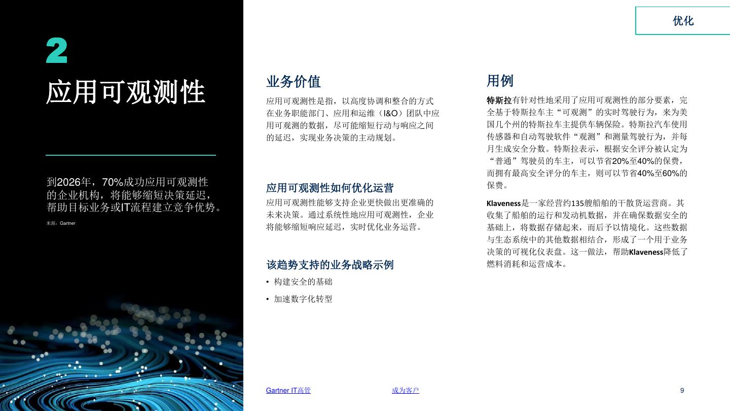 9 . 优化 2 业务价值 用例 应用可观测性 应用可观测性是指,以高度协调和整合的方式 特斯拉有针对性地采用了应用可观测性的部分要素,完 在业务职能部门、应用和运维(I&O)团队中应 全基于特斯拉车主“可观测”的实时驾驶行为,来为美 用可观测的数据,尽可能缩短行动与响应之间 国几个州的特斯拉车主提供车辆保险。特斯拉汽车使用 的延迟,实现业务决策的主动规划。 传感器和自动驾驶软件“观测”和测量驾驶行为,并每 月生成安全分数。特斯拉表示,根据安全评分被认定为 “普通”驾驶员的车主,可以节省20%至40%的保费, 而拥有最高安全评分的车主,则可以节省40%至60%的 到2026年,70%成功应用可观测性 保费。 应用可观测性如何优化运营 的企业机构,将能够缩短决策延迟, 应用可观测性能够支持企业更快做出更准确的 Klaveness是一家经营约135艘船舶的干散货运营商。其 帮助目标业务或IT流程建立竞争优势。 未来决策。通过系统性地应用可观测性,企业 收集了船舶的运行和发动机数据,并在确保数据安全的 来源:Gartner 将能够缩短响应延迟,实时优化业务运营。 基础上,将数据存储起来,而后予以情境化。这些数据 与生态系统中的其他数据相结合,形成了一个用于业务 决策的可视化仪表盘。这一做法,帮助Klaveness降低了 该趋势支持的业务战略示例 燃料消耗和运营成本。 • 构建安全的基础 • 加速数字化转型 Gartner IT高管 成为客户 9 2023年重要战略技术趋势