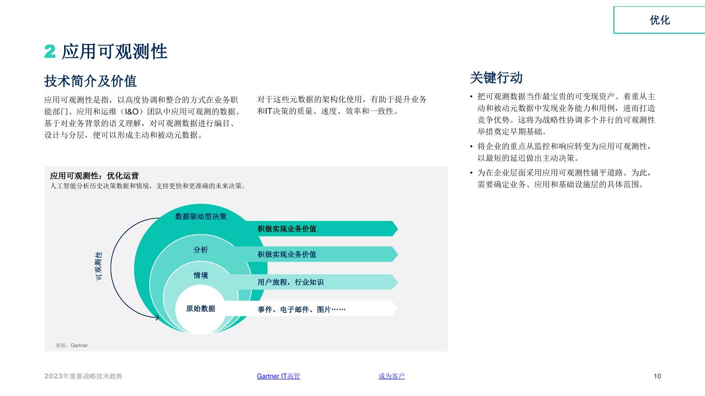 10 . 优化 2 应用可观测性 技术简介及价值 关键行动 应用可观测性是指,以高度协调和整合的方式在业务职 对于这些元数据的架构化使用,有助于提升业务 • 把可观测数据当作最宝贵的可变现资产。着重从主 能部门、应用和运维(I&O)团队中应用可观测的数据。 和IT决策的质量、速度、效率和一致性。 动和被动元数据中发现业务能力和用例,进而打造 基于对业务背景的语义理解,对可观测数据进行编目、 竞争优势。这将为战略性协调多个并行的可观测性 设计与分层,便可以形成主动和被动元数据。 举措奠定早期基础。 • 将企业的重点从监控和响应转变为应用可观测性, 以最短的延迟做出主动决策。 应用可观测性:优化运营 • 为在企业层面采用应用可观测性铺平道路。为此, 人工智能分析历史决策数据和情境,支持更快和更准确的未来决策。 需要确定业务、应用和基础设施层的具体范围。 数据驱动型决策 积极实现业务价值 分析 积极实现业务价值 情境 用户旅程,行业知识 原始数据 事件、电子邮件、图片…… 来源:Gartner 2023年重要战略技术趋势 Gartner IT高管 成为客户 10