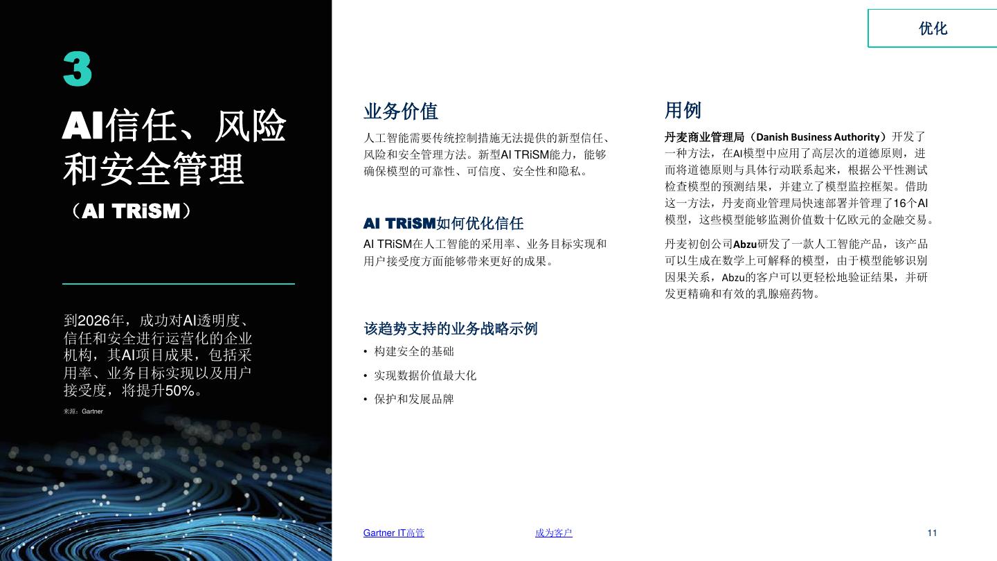 11 . 优化 3 AI信任、风险 业务价值 用例 人工智能需要传统控制措施无法提供的新型信任、 丹麦商业管理局(Danish Business Authority)开发了 风险和安全管理方法。新型AI TRiSM能力,能够 一种方法,在AI模型中应用了高层次的道德原则,进 和安全管理 确保模型的可靠性、可信度、安全性和隐私。 而将道德原则与具体行动联系起来,根据公平性测试 检查模型的预测结果,并建立了模型监控框架。借助 (AI TRiSM) 这一方法,丹麦商业管理局快速部署并管理了16个AI AI TRiSM如何优化信任 模型,这些模型能够监测价值数十亿欧元的金融交易。 AI TRiSM在人工智能的采用率、业务目标实现和 丹麦初创公司Abzu研发了一款人工智能产品,该产品 用户接受度方面能够带来更好的成果。 可以生成在数学上可解释的模型,由于模型能够识别 因果关系,Abzu的客户可以更轻松地验证结果,并研 发更精确和有效的乳腺癌药物。 到2026年,成功对AI透明度、 该趋势支持的业务战略示例 信任和安全进行运营化的企业 机构,其AI项目成果,包括采 • 构建安全的基础 用率、业务目标实现以及用户 • 实现数据价值最大化 接受度,将提升50%。 • 保护和发展品牌 来源:Gartner Gartner IT高管 成为客户 11