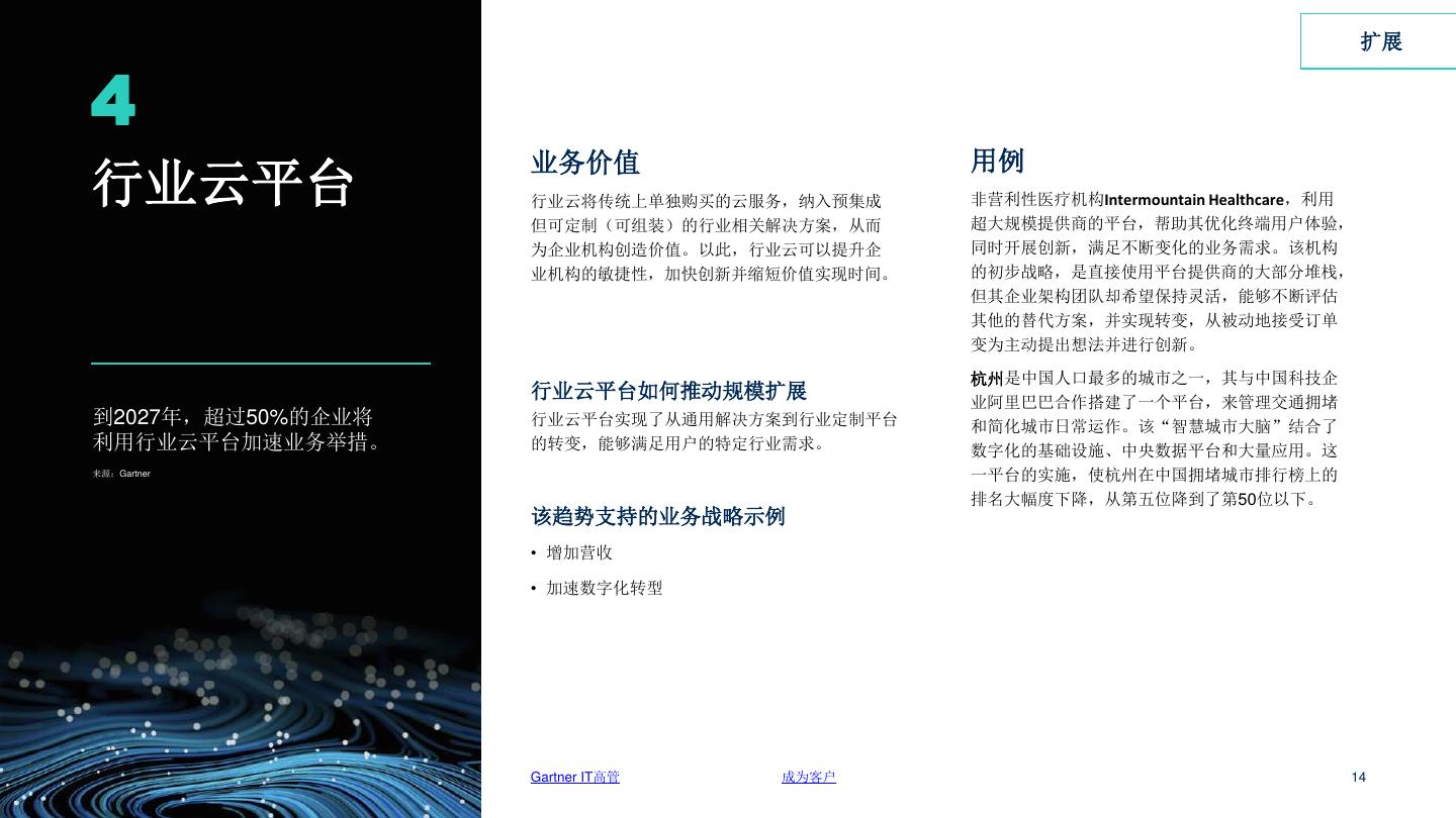 14 . 扩展 4 业务价值 用例 行业云平台 行业云将传统上单独购买的云服务,纳入预集成 非营利性医疗机构Intermountain Healthcare,利用 但可定制(可组装)的行业相关解决方案,从而 超大规模提供商的平台,帮助其优化终端用户体验, 为企业机构创造价值。以此,行业云可以提升企 同时开展创新,满足不断变化的业务需求。该机构 业机构的敏捷性,加快创新并缩短价值实现时间。 的初步战略,是直接使用平台提供商的大部分堆栈, 但其企业架构团队却希望保持灵活,能够不断评估 其他的替代方案,并实现转变,从被动地接受订单 变为主动提出想法并进行创新。 杭州是中国人口最多的城市之一,其与中国科技企 行业云平台如何推动规模扩展 业阿里巴巴合作搭建了一个平台,来管理交通拥堵 到2027年,超过50%的企业将 行业云平台实现了从通用解决方案到行业定制平台 和简化城市日常运作。该“智慧城市大脑”结合了 利用行业云平台加速业务举措。 的转变,能够满足用户的特定行业需求。 数字化的基础设施、中央数据平台和大量应用。这 来源:Gartner 一平台的实施,使杭州在中国拥堵城市排行榜上的 排名大幅度下降,从第五位降到了第50位以下。 该趋势支持的业务战略示例 • 增加营收 • 加速数字化转型 Gartner IT高管 成为客户 14