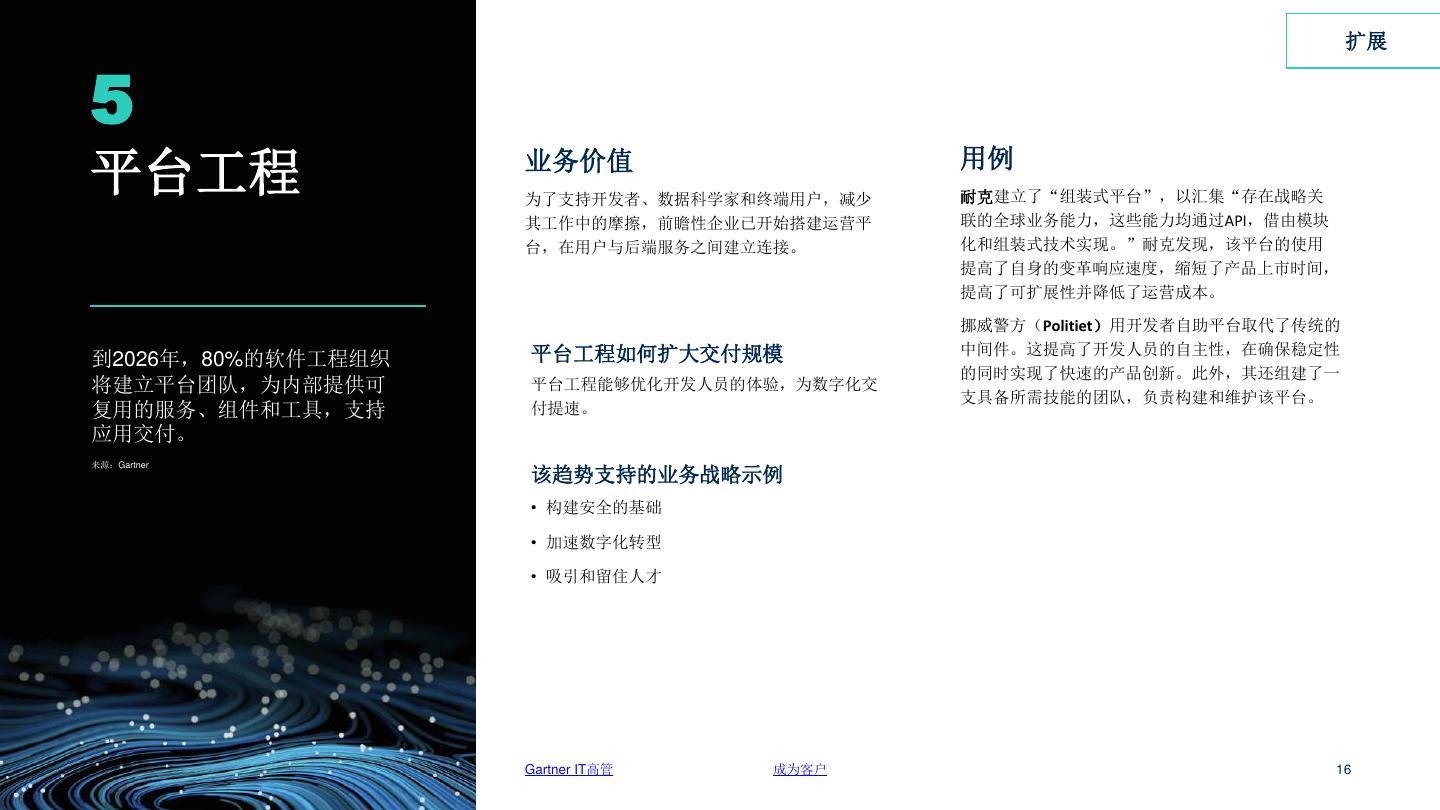 16 . 扩展 5 用例 平台工程 业务价值 为了支持开发者、数据科学家和终端用户,减少 耐克建立了“组装式平台”,以汇集“存在战略关 其工作中的摩擦,前瞻性企业已开始搭建运营平 联的全球业务能力,这些能力均通过API,借由模块 台,在用户与后端服务之间建立连接。 化和组装式技术实现。”耐克发现,该平台的使用 提高了自身的变革响应速度,缩短了产品上市时间, 提高了可扩展性并降低了运营成本。 挪威警方(Politiet)用开发者自助平台取代了传统的 平台工程如何扩大交付规模 中间件。这提高了开发人员的自主性,在确保稳定性 到2026年,80%的软件工程组织 的同时实现了快速的产品创新。此外,其还组建了一 将建立平台团队,为内部提供可 平台工程能够优化开发人员的体验,为数字化交 支具备所需技能的团队,负责构建和维护该平台。 复用的服务、组件和工具,支持 付提速。 应用交付。 来源:Gartner 该趋势支持的业务战略示例 • 构建安全的基础 • 加速数字化转型 • 吸引和留住人才 Gartner IT高管 成为客户 16